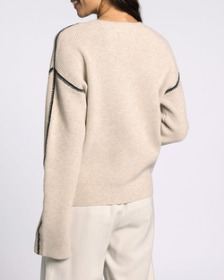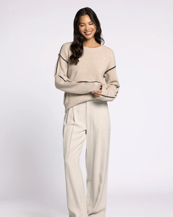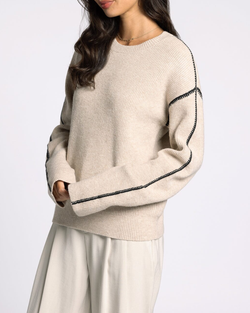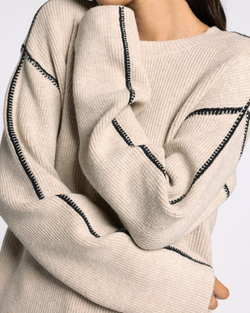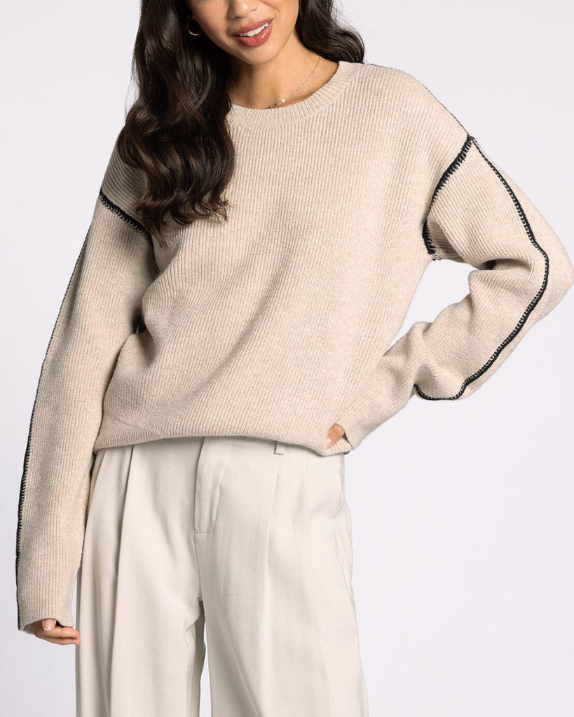 The Pomona Sweater in Cream features a trendy drop shoulder design for a relaxed vibe. Playful contrast stitching adds a fun twist to your cozy look.