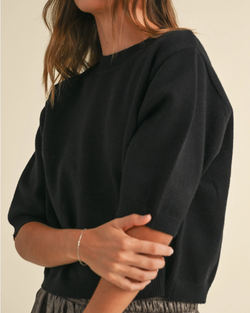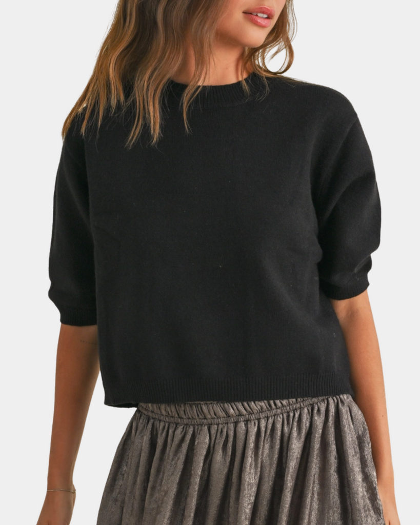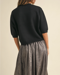 Cozy meets cute in this black short sleeve sweater top—perfect for layering or wearing solo on breezy days.