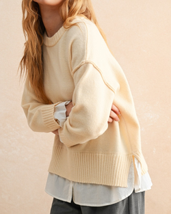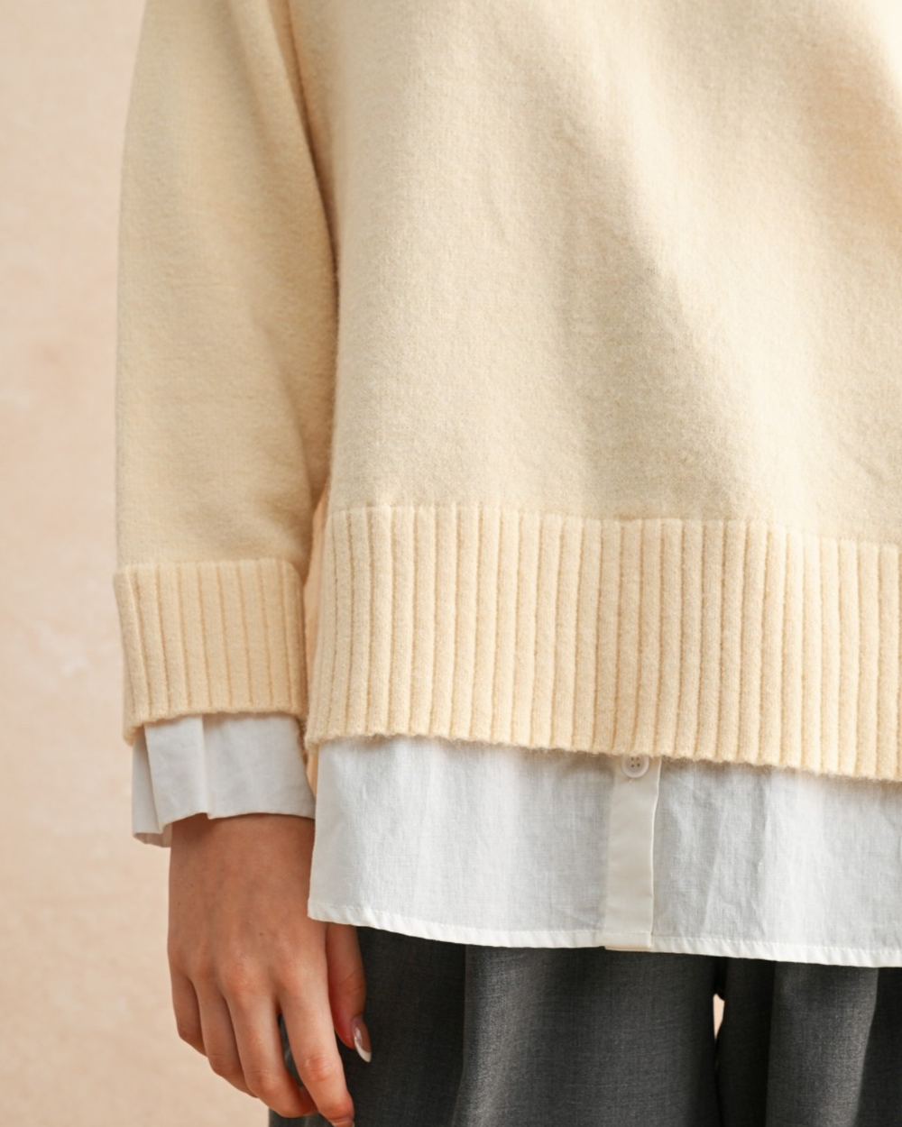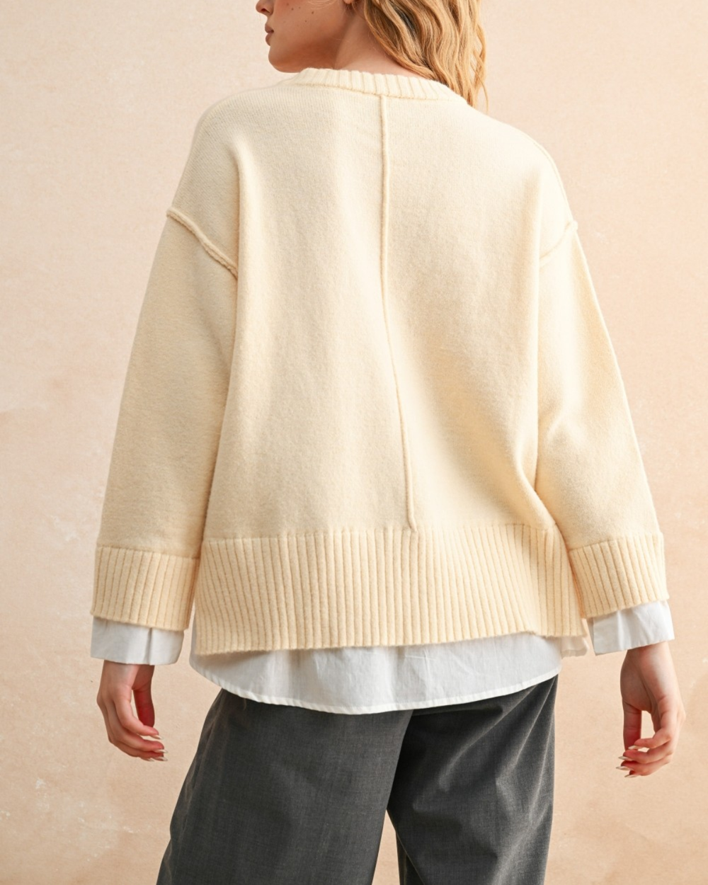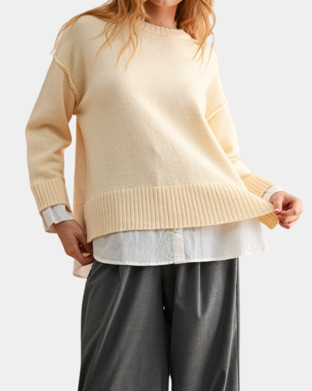 Get two looks in one with this beige layered set! A crisp button-up peeks out from a soft, huggable sweater for instant sophistication. No overthinking required.