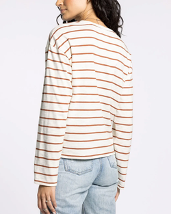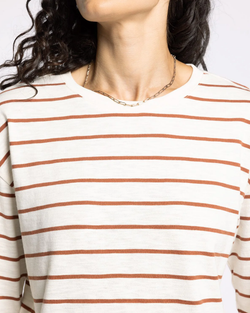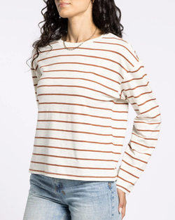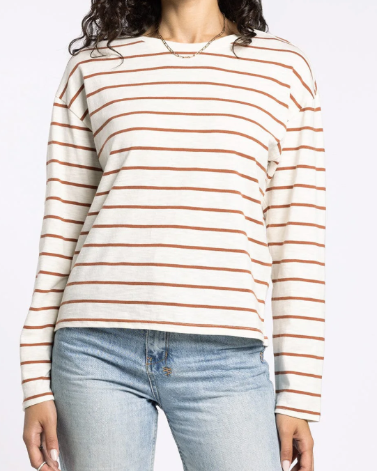 Elevate your fall wardrobe with this darling stripe top. Featuring a classic crew neckline and relaxed drop shoulder design, this piece blends casual ease with refined style. Its warm, seasonal colors make it a versatile choice for autumn layering or standalone wear, perfect for a sophisticated yet effortless look.