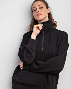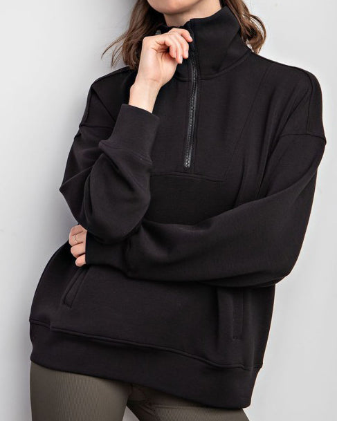 This ultra soft quarter zip pullover is made from a modal poly spandex fabrication that is butter smooth with cooling fabric. Featuring a quarter zip, mock neckline, kangaroo pocket and long sleeves, this is your new favorite casual wear piece.