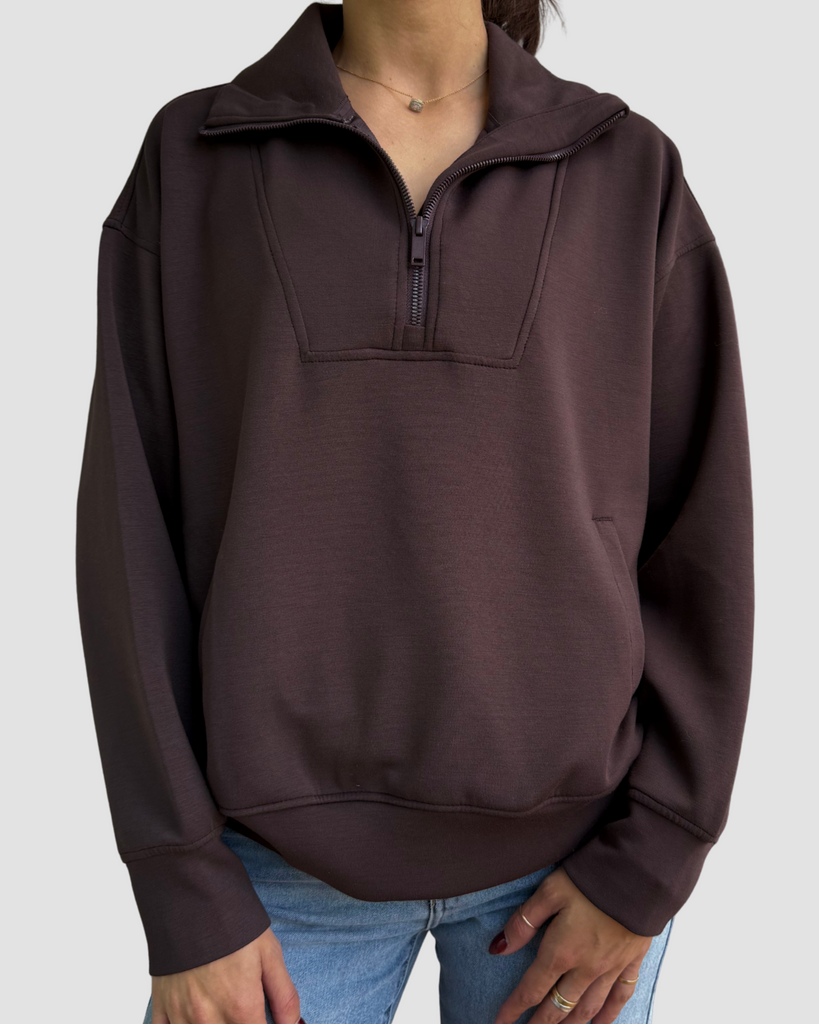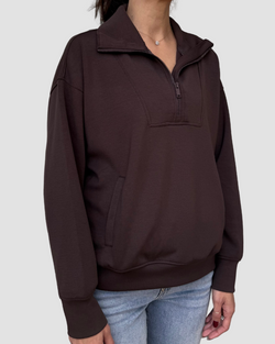 This ultra soft quarter zip pullover is made from a modal poly spandex fabrication that is butter smooth with cooling fabric. Featuring a quarter zip, mock neckline, kangaroo pocket and long sleeves, this is your new favorite casual wear piece.