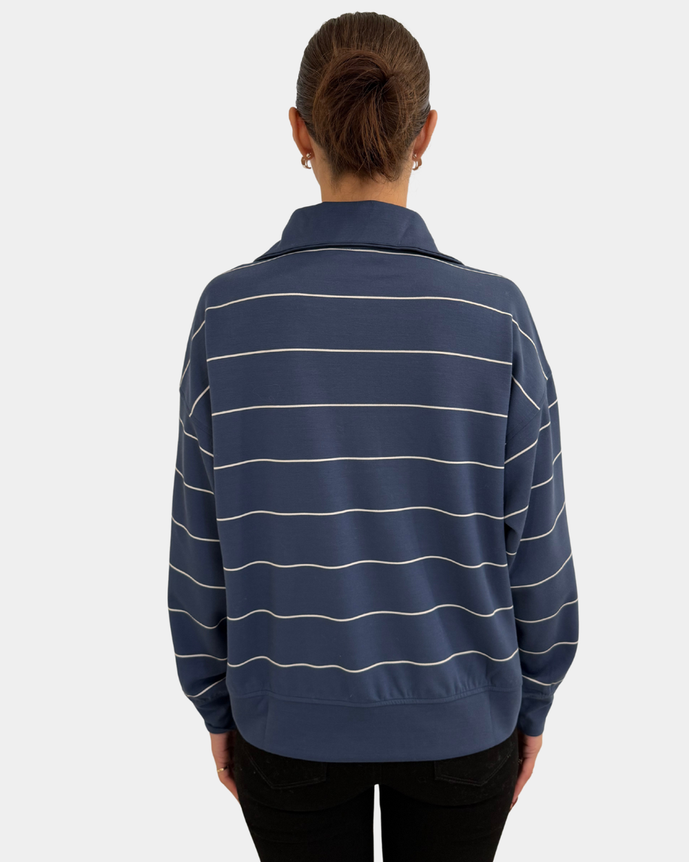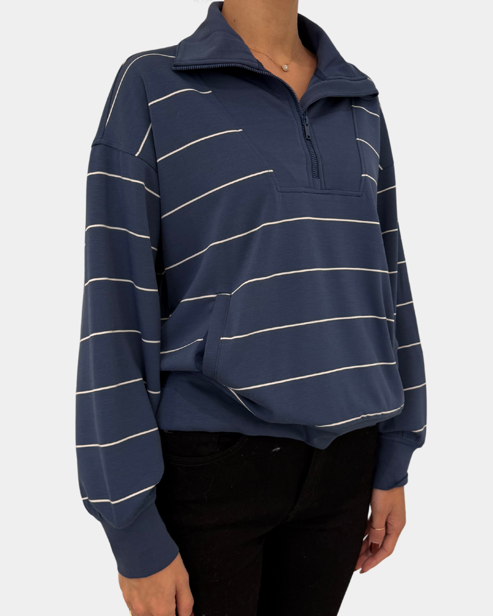Enjoy ultimate comfort in this soft, lightweight striped pullover with a chic mock neck and handy quarter zip. The cozy kangaroo pocket makes it perfect for lounging or adventures with a playful touch.