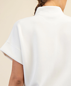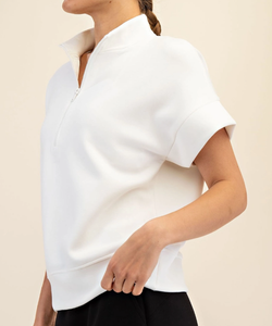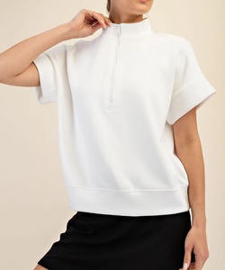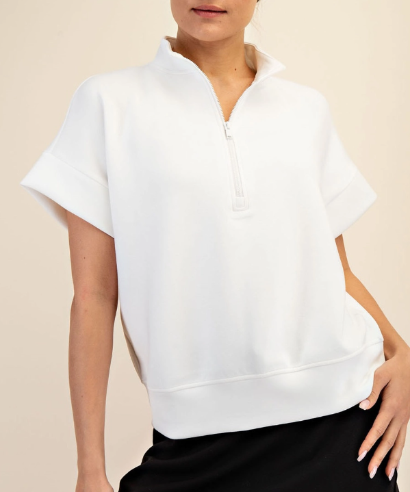A short sleeve top made from luxurious, silky-smooth fabric, featuring a stylish quarter zip closure. Soft and refined, it adds an elevated touch to your everyday style.