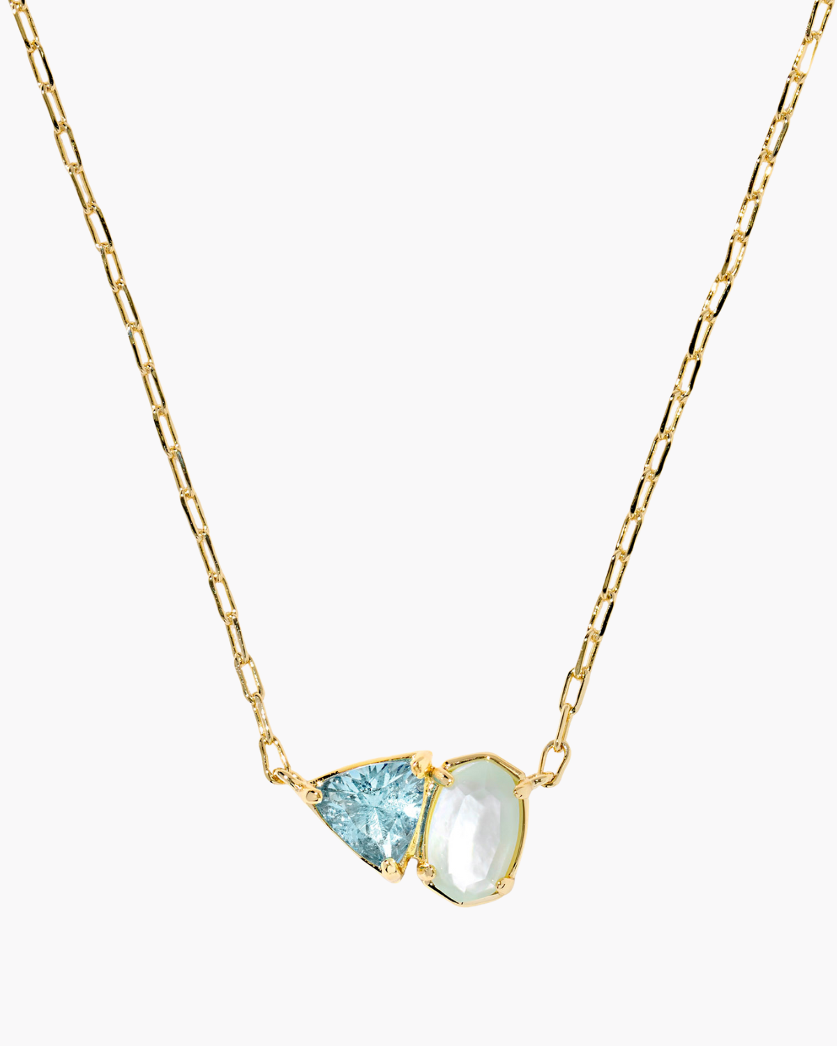 The Tatum Short Pendant Necklace reimagines the toi et moi aesthetic with the Kendra Scott signature Elisa silhouette and trillion-cut stone in March birthstone tones. Crafted on a delicate gold chain, this refined piece transitions seamlessly from daily wear to meaningful occasions.