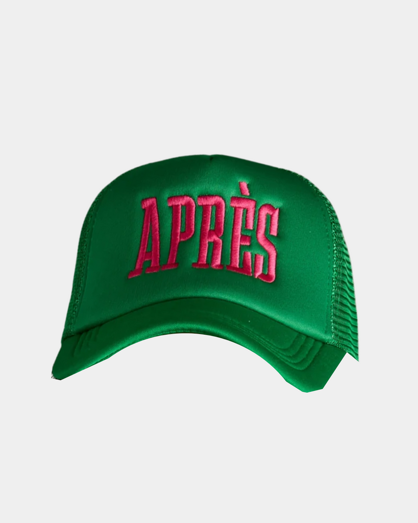 Top off your look with the playful charm of the Apres Trucker Hat in green, perfect for sunny days and spontaneous adventures. Its classic mesh back keeps you cool while adding a splash of fun to any outfit.