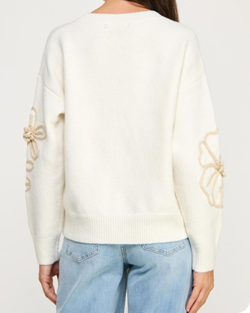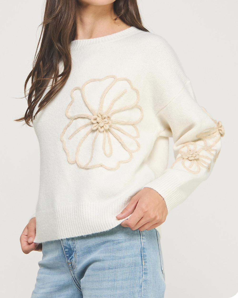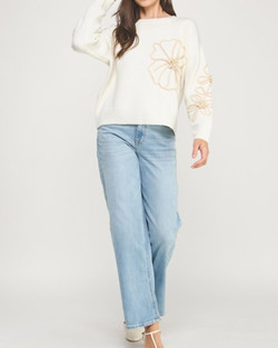 This elegant knit sweater showcases delicate floral embroidery in contrasting hues. Crafted from soft knit fabric, it features a round ribbed neckline, long sleeves finished with ribbed cuffs, and a ribbed hem for a refined silhouette.