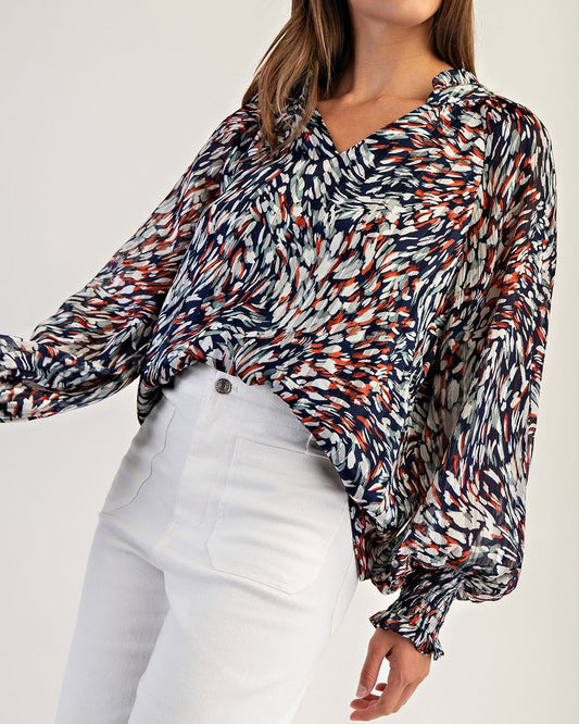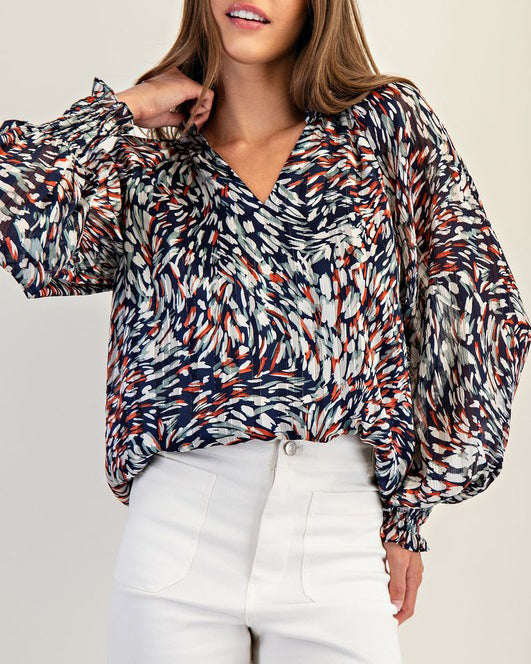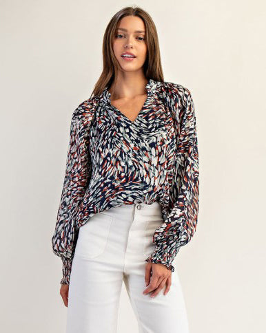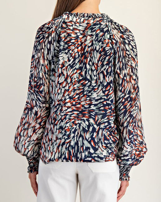 This lightweight blouse features a vibrant brushstroke print, a ruffle notched neckline, long sleeves with smocked cuffs and a relaxed silhouette for a polished and chic look.