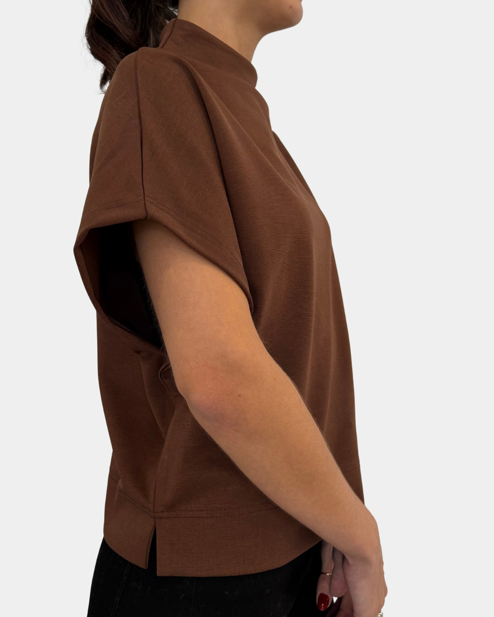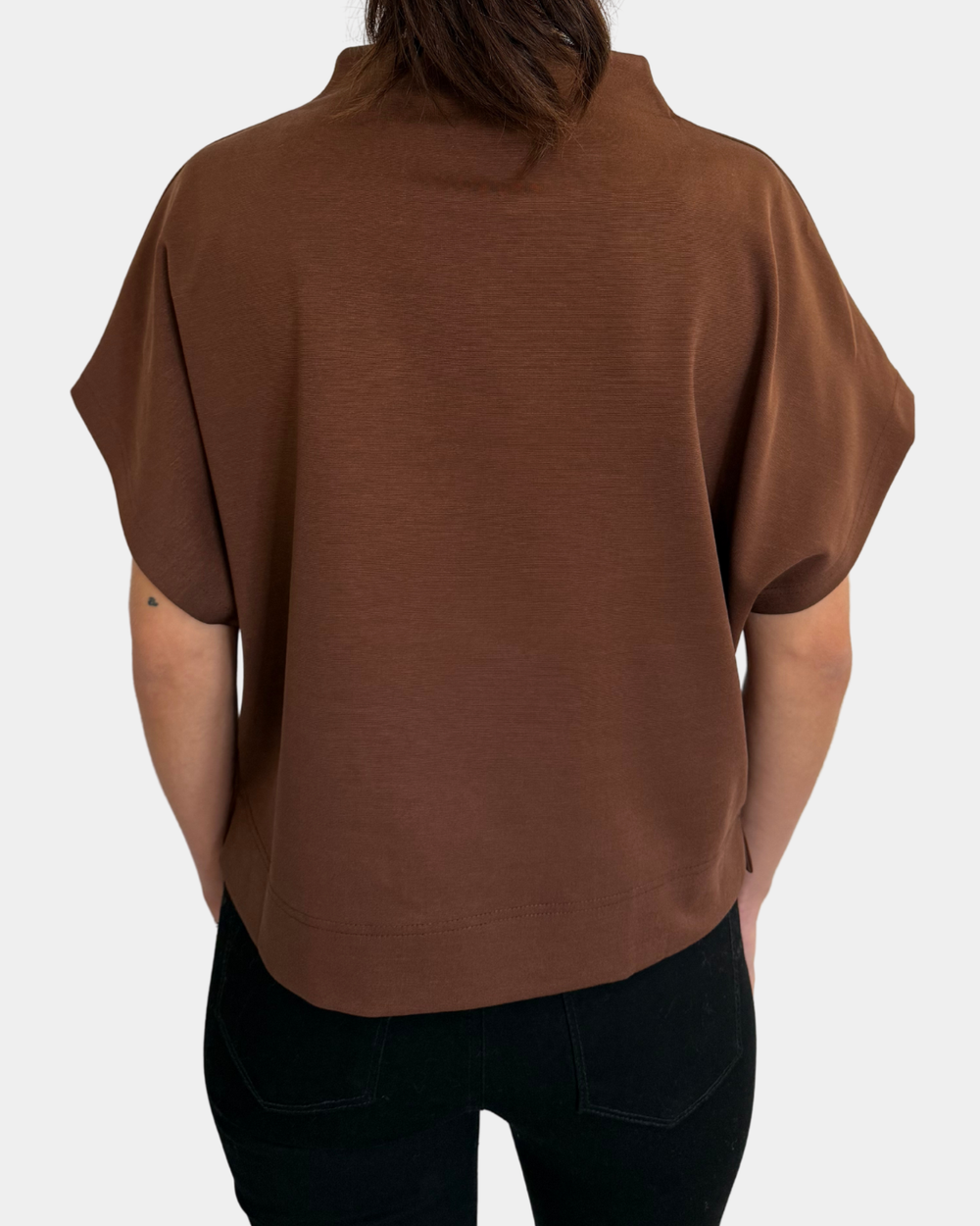 This brown mock neck top offers a sleek standing collar paired with short sleeves for an elegant and comfortable style.