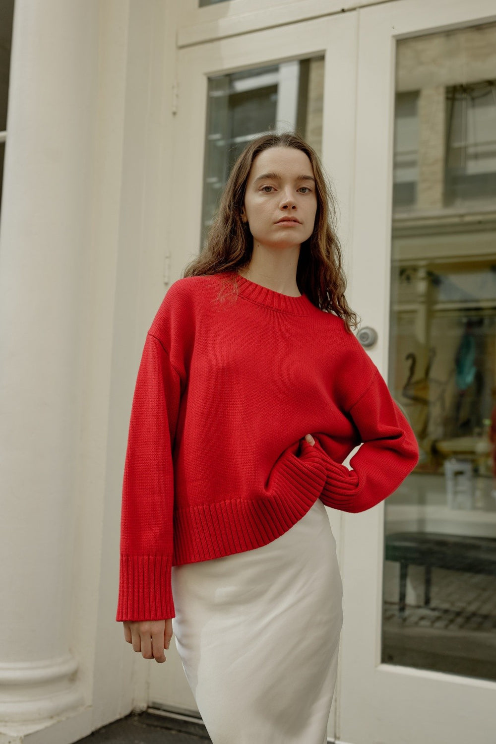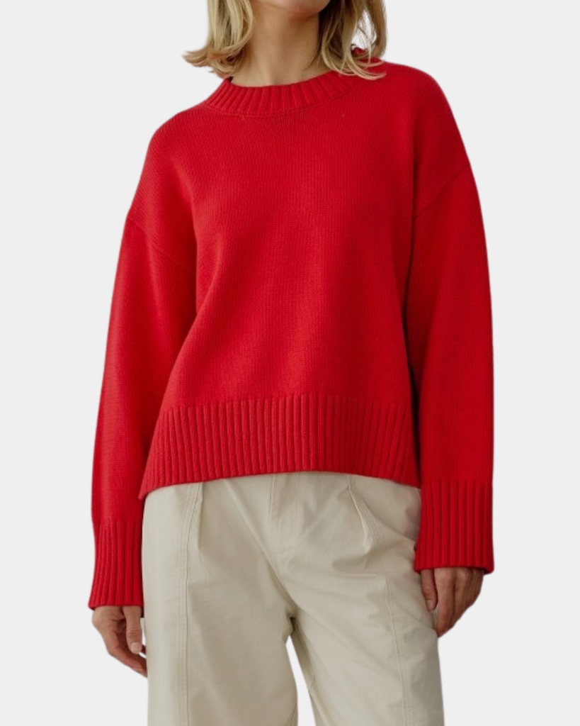 Meet your new cold-weather favorite: an oversized cropped pullover with ribbed details and mid-weight warmth. The semi-cropped cut keeps things proportional while the cherry red hue adds instant personality to any seasonal look.