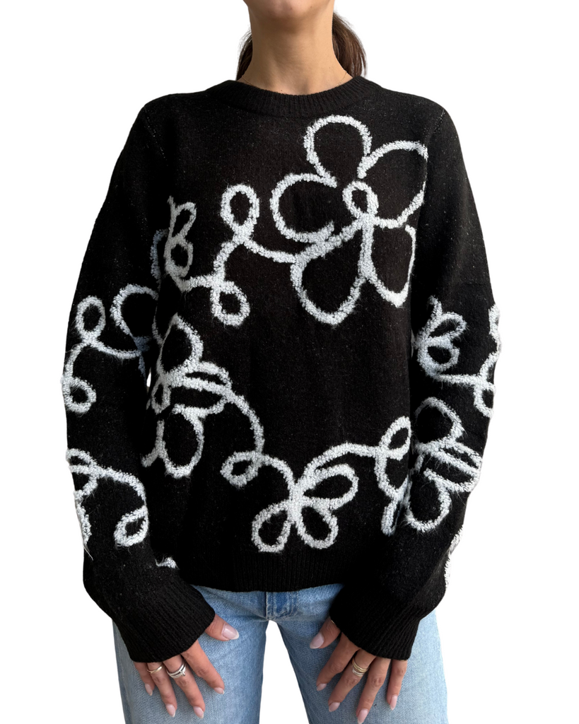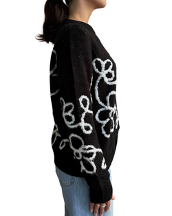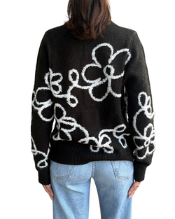 This black mohair sweater blooms with playful floral details, adding a fun twist to your cozy wardrobe. It’s your new go-to for feeling warm and wonderfully whimsical all season long.