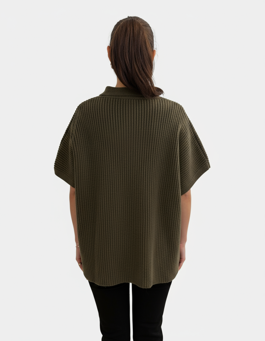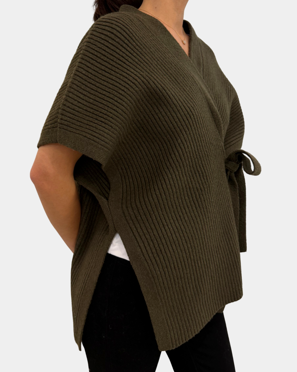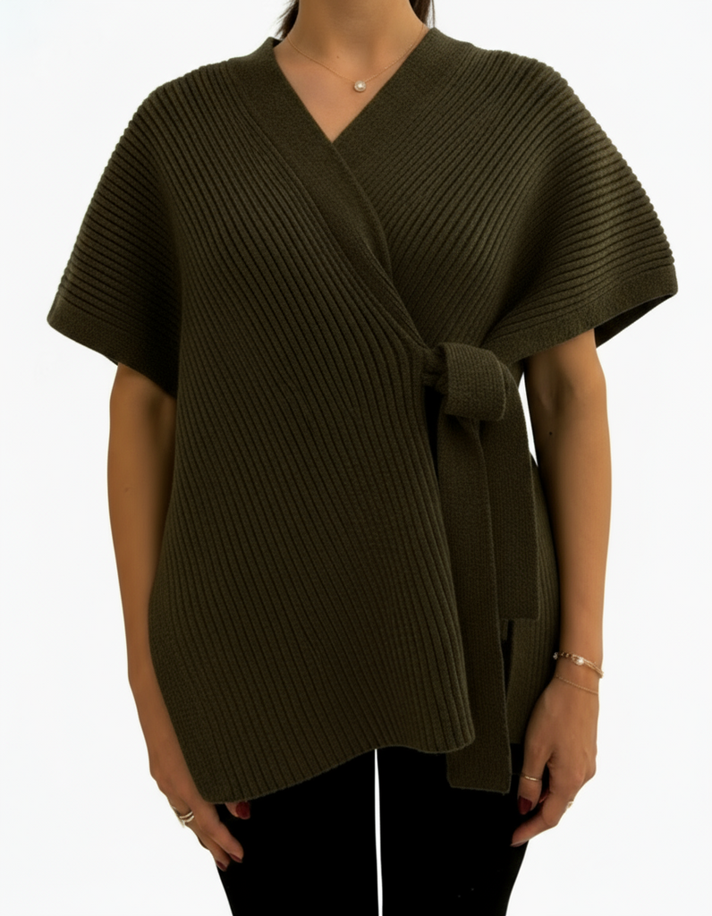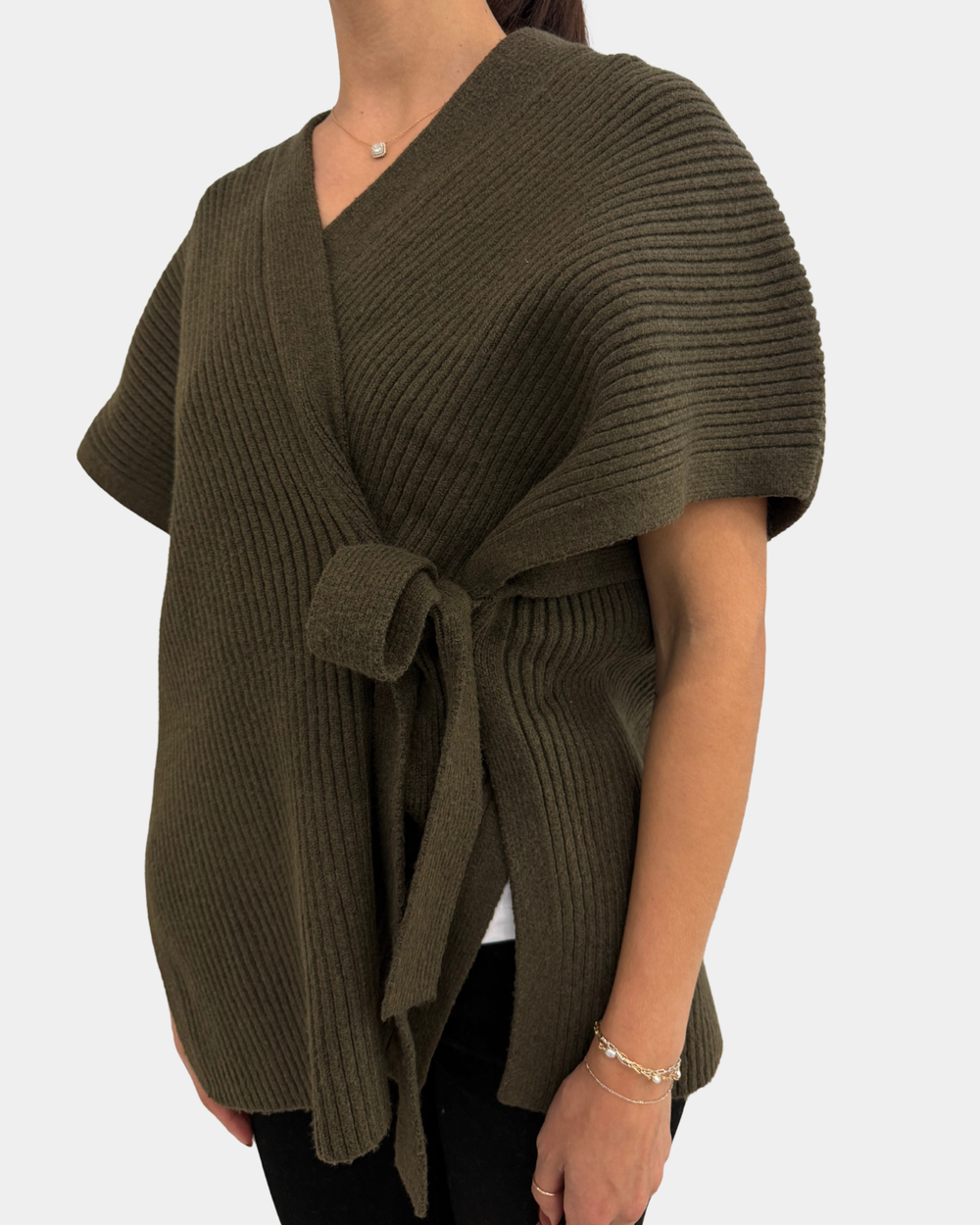 Elevate your layering with this sleeveless knitted cardigan in a rich olive hue, featuring a graceful tie bow at the side waist for a refined silhouette. The subtle side slit adds movement and modern elegance to your ensemble.