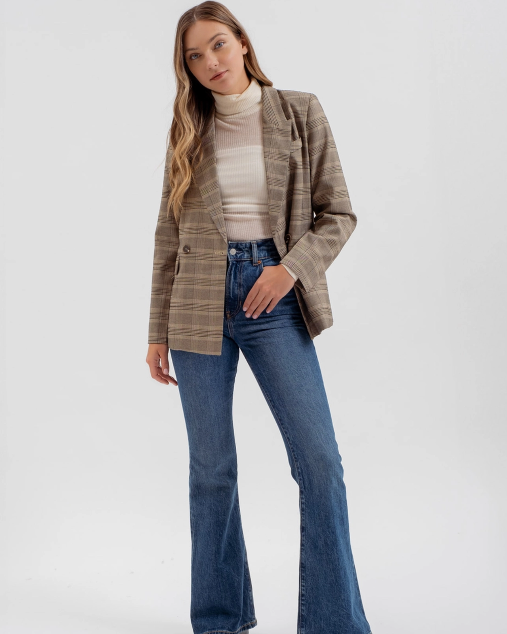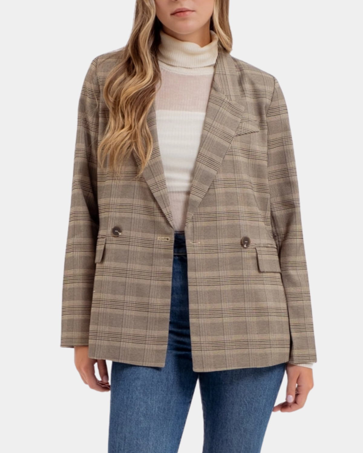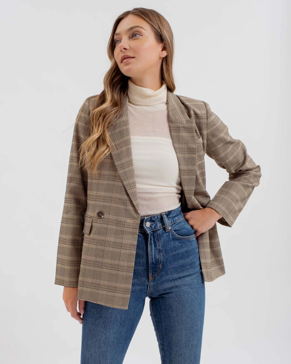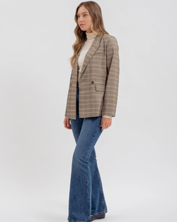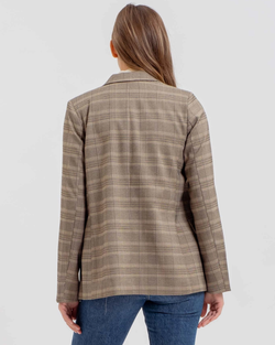 This khaki plaid blazer combines timeless pattern with understated elegance. A sophisticated staple for building a versatile, polished wardrobe.