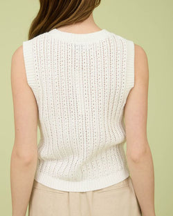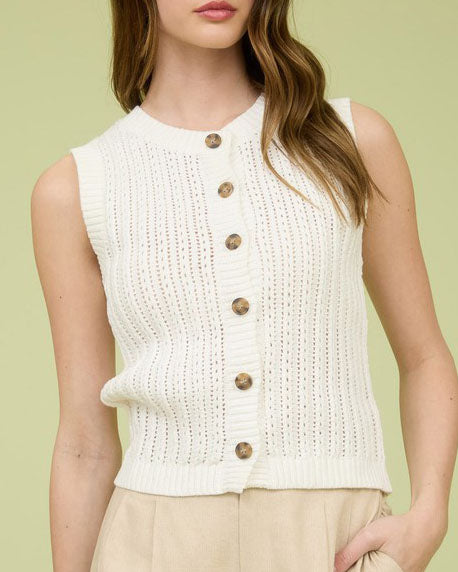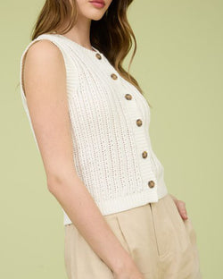 This soft knit cardigan vest features a button down front, a crew neckline and a ribbed trim. A wardrobe staple to style with everything from jeans to shorts to skirts.