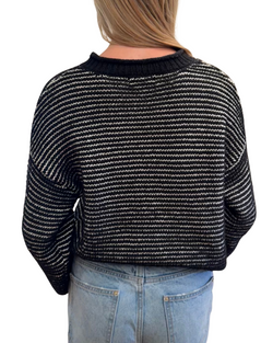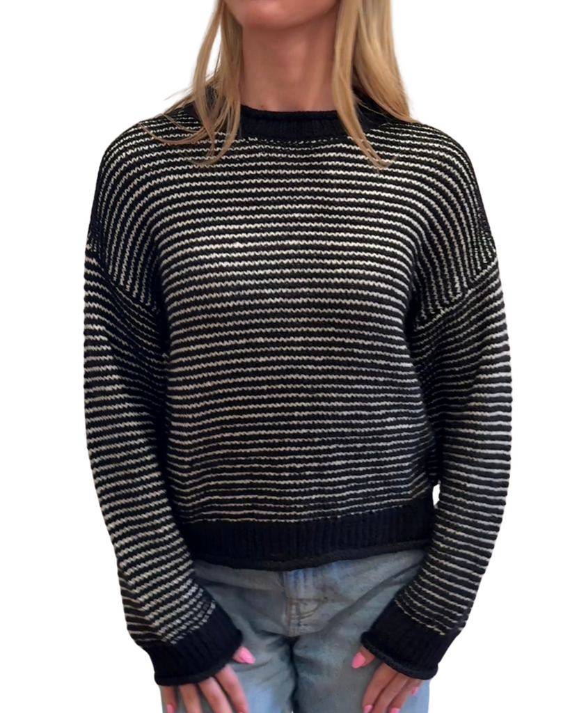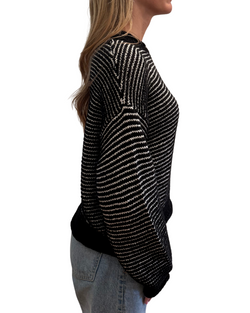 Stay cozy and cool in this black striped pullover sweater, designed with an oversized fit for maximum comfort and style. Perfect for layering up or lounging around, it’s your new go-to for effortless laid-back vibes.