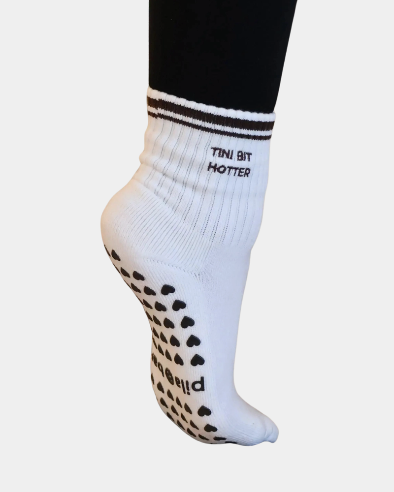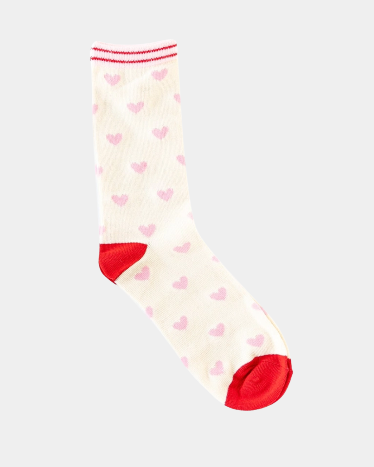 Love on your feet! These playful crew socks feature a charming pink heart pattern on a cream background. Cozy, cute, and perfect for showing off your softer side with every step.