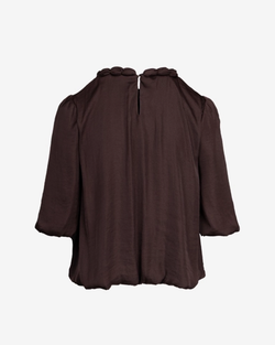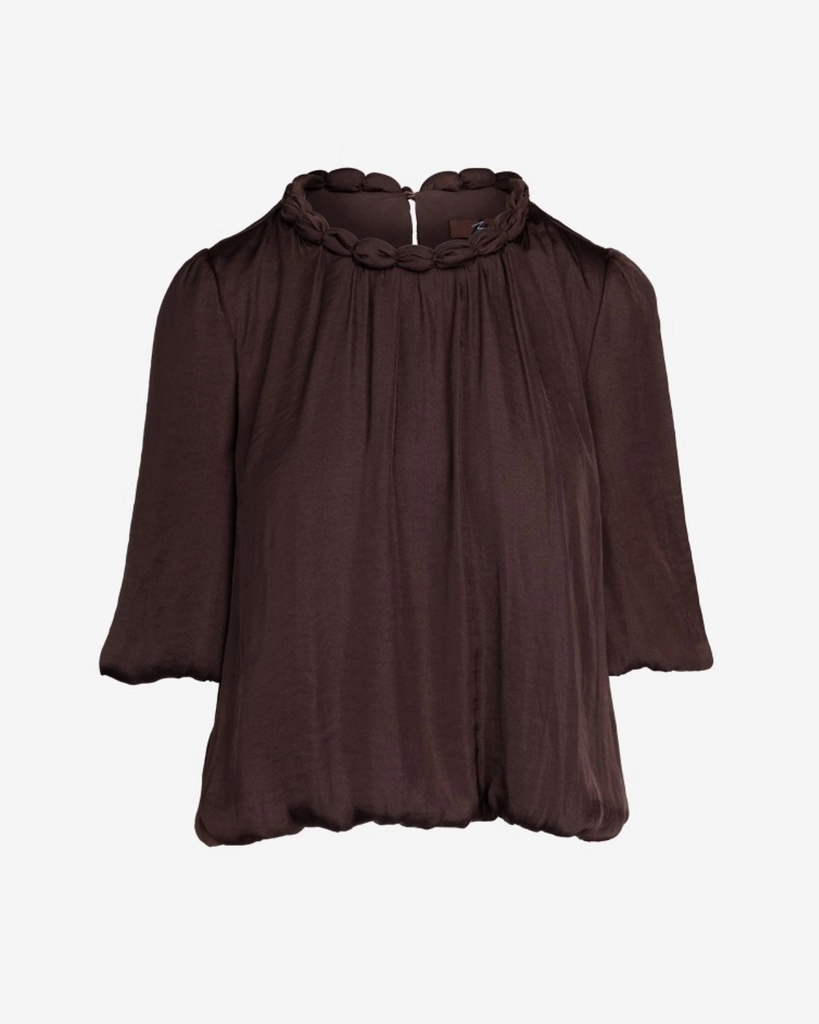 This billowy blouse features lightweight woven fabric with a smooth lining and playful ball detailing along the round neckline. The half sleeves with bubble hems and back keyhole closure add charming dimension, making it perfect for tucking into tailored pants or pairing with denim for a stylish evening look.