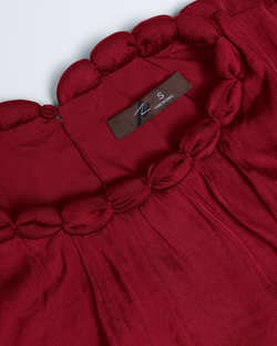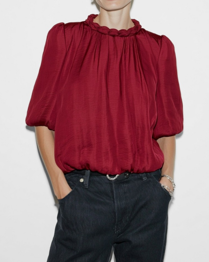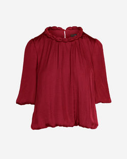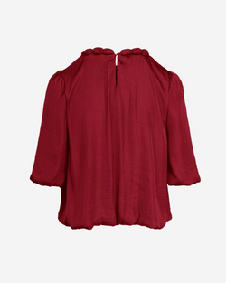 This billowy blouse features lightweight woven fabric with a smooth lining and playful ball detailing along the round neckline. The half sleeves with bubble hems and back keyhole closure add charming dimension, making it perfect for tucking into tailored pants or pairing with denim for a stylish evening look.