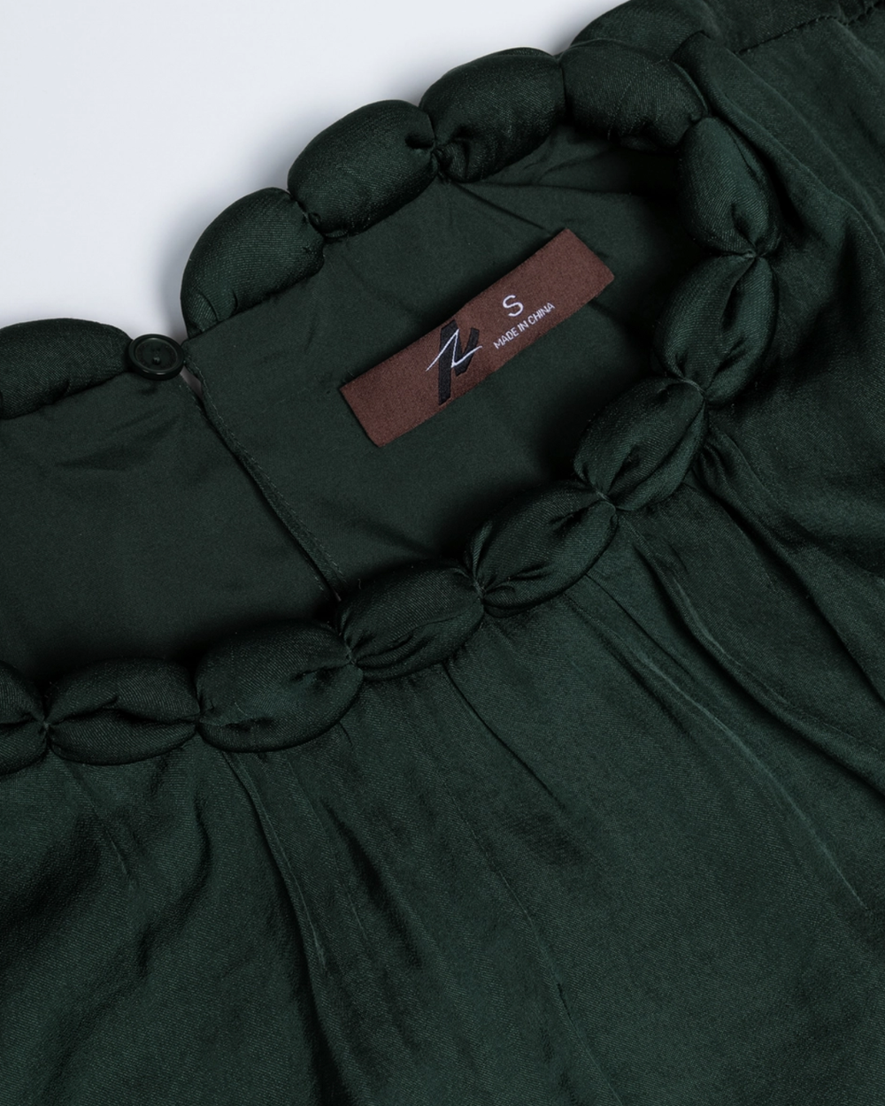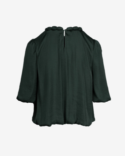 This billowy blouse features lightweight woven fabric with a smooth lining and playful ball detailing along the round neckline. The half sleeves with bubble hems and back keyhole closure add charming dimension, making it perfect for tucking into tailored pants or pairing with denim for a stylish evening look.