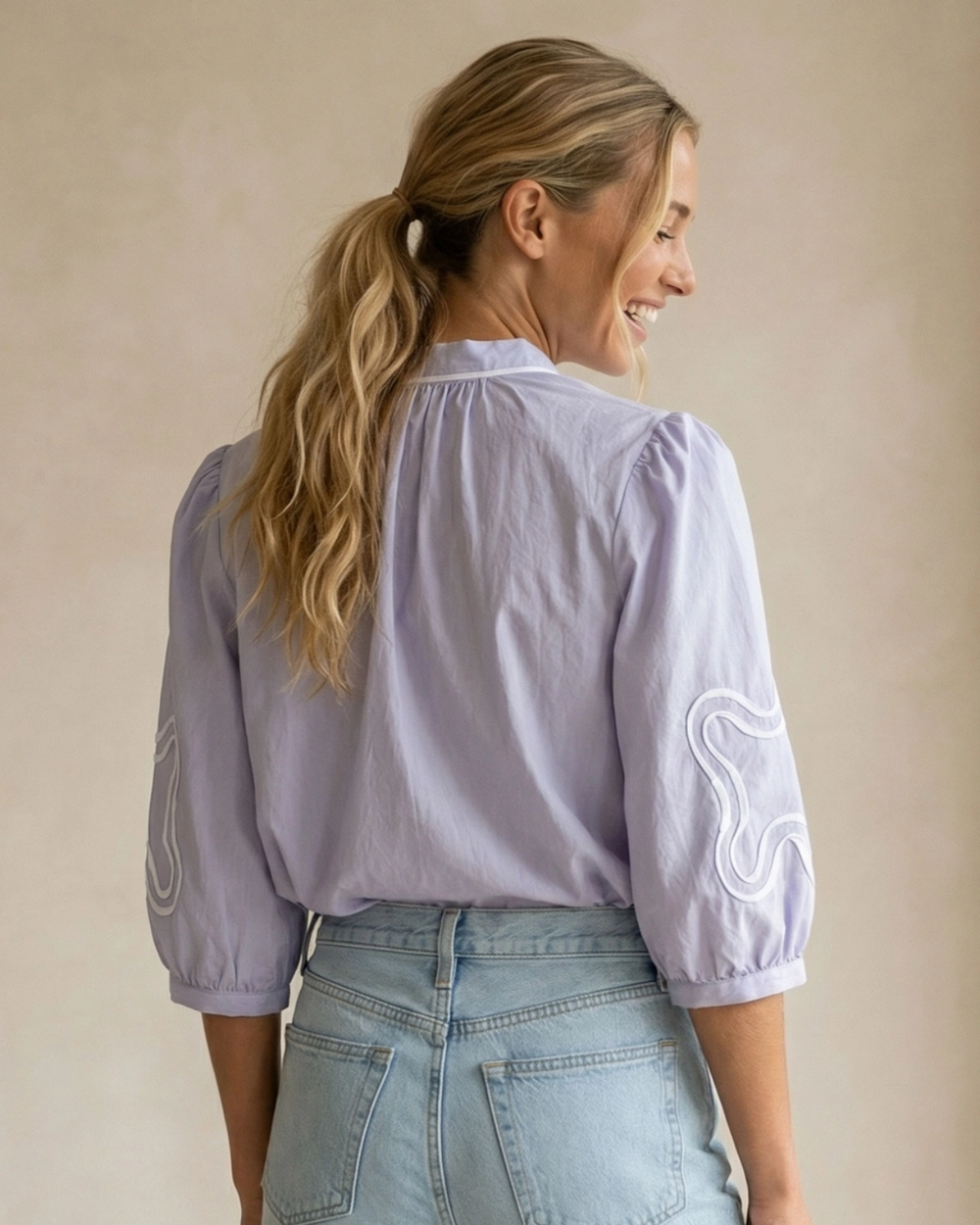 This lilac blouse showcases artistic abstract floral appliqués on three-quarter sleeves, offering sophisticated versatility for any occasion. Wear with tailored trousers for refined polish or style with a denim maxi skirt for contemporary ease.