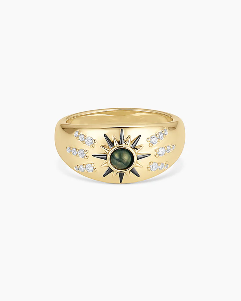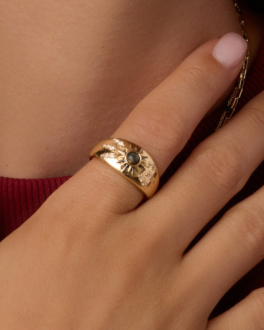 This 18k gold-plated cocktail ring pairs genuine black labradorite with cubic zirconia in a vintage-inspired design. Wear it solo for understated elegance or stack with complementary pieces for bold impact.