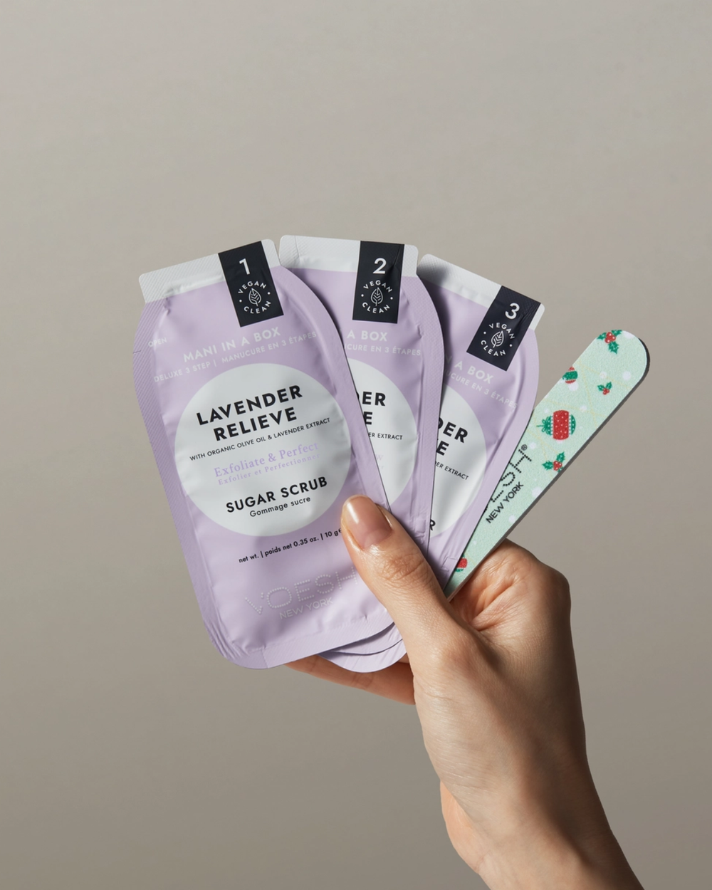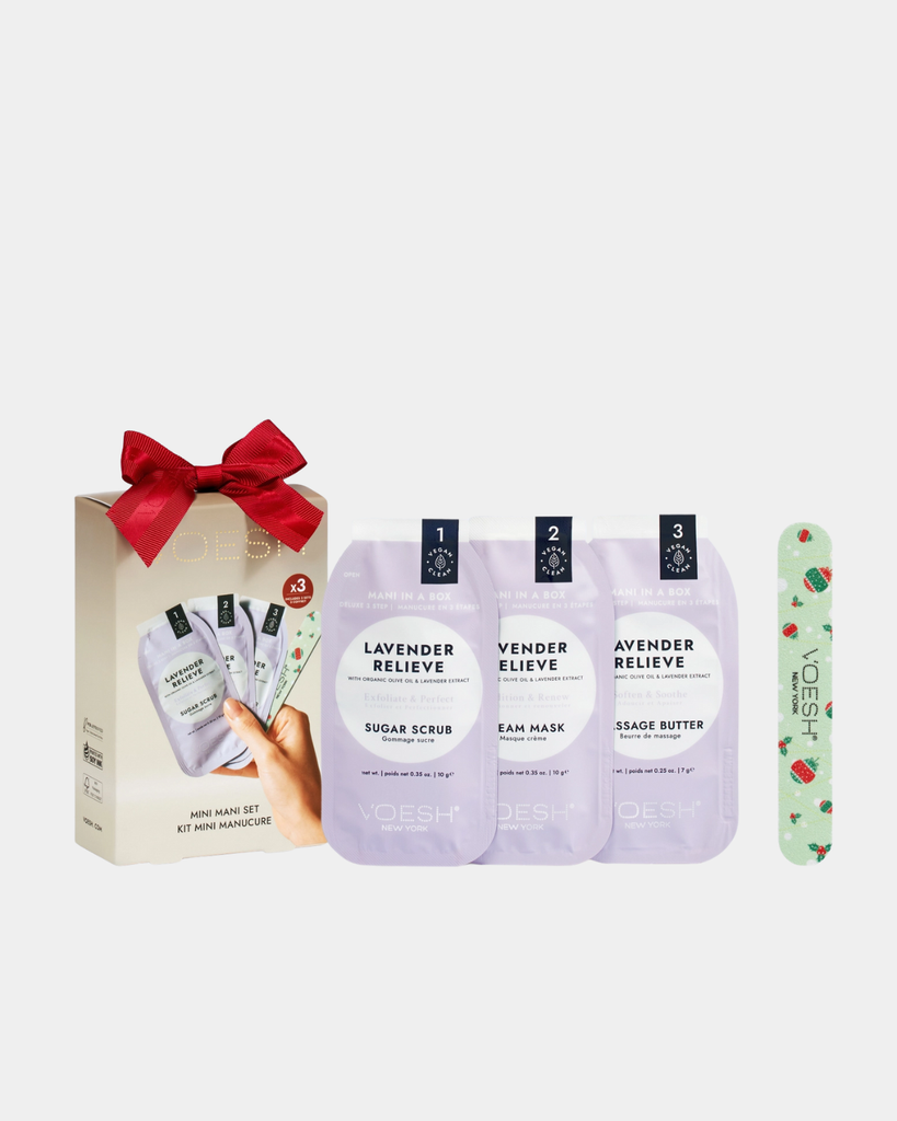 Treat your hands to a mini spa day with the Mini Mani Set, featuring three lavender-scented kits packed with sugar scrub, cream mask, and massage butter for ultra-soft, glowing skin. Infused with calming lavender and nourishing olive oil, this set comes with a festive nail file—perfect for brightening both hands and spirits this season!