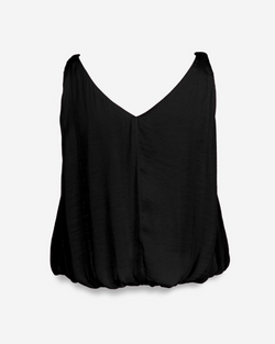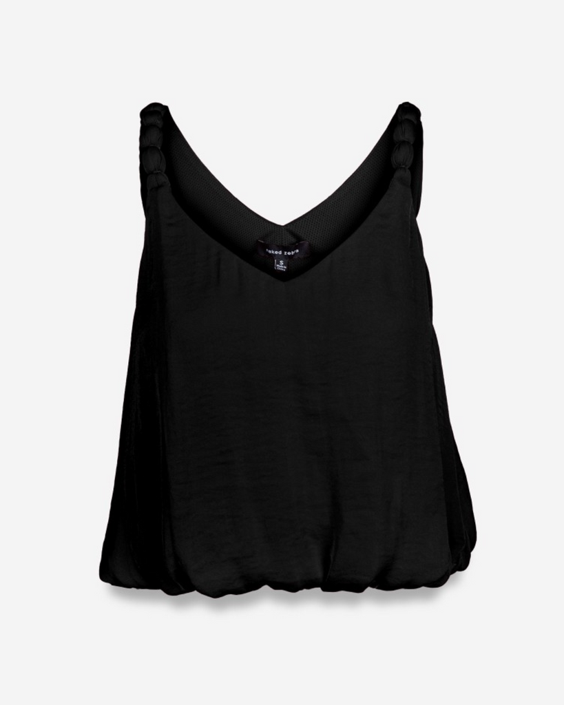 This silky tank top feels light and soft, featuring playful strap accents finished with charming ball details. Its bubble hem adds fun volume and gives it a fresh, billowy silhouette.