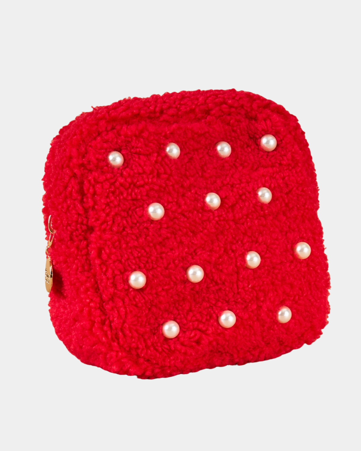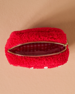 Soft sherpa meets practical charm in this Pearl Red Teddy Pouch. The wipeable lining keeps messes at bay, while a gold zipper adds a dash of elegance. Perfect for organizing small treasures and mixing with our other pouch shapes.
