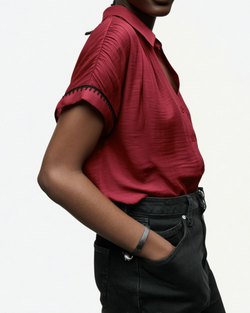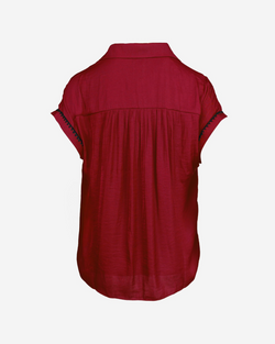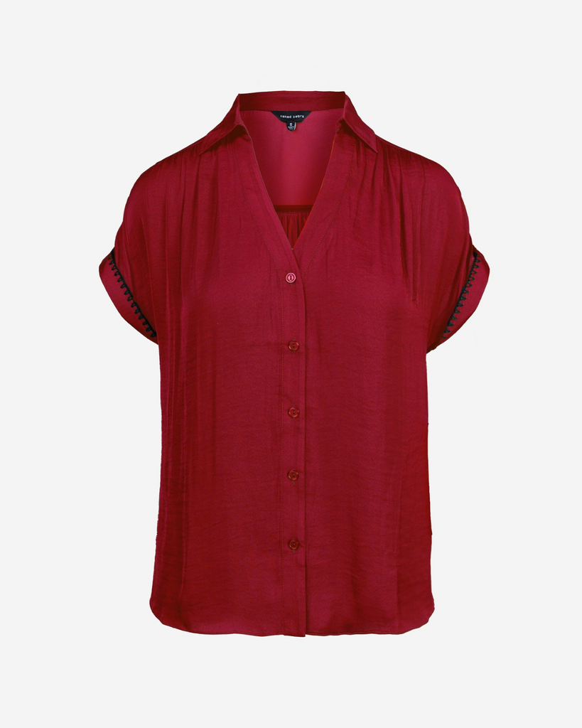 This playful blouse features a crisp collar and button front accented by bold whipstitch details. With short sleeves and a relaxed fit, it’s an easygoing layer perfect for everyday fun.