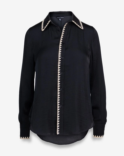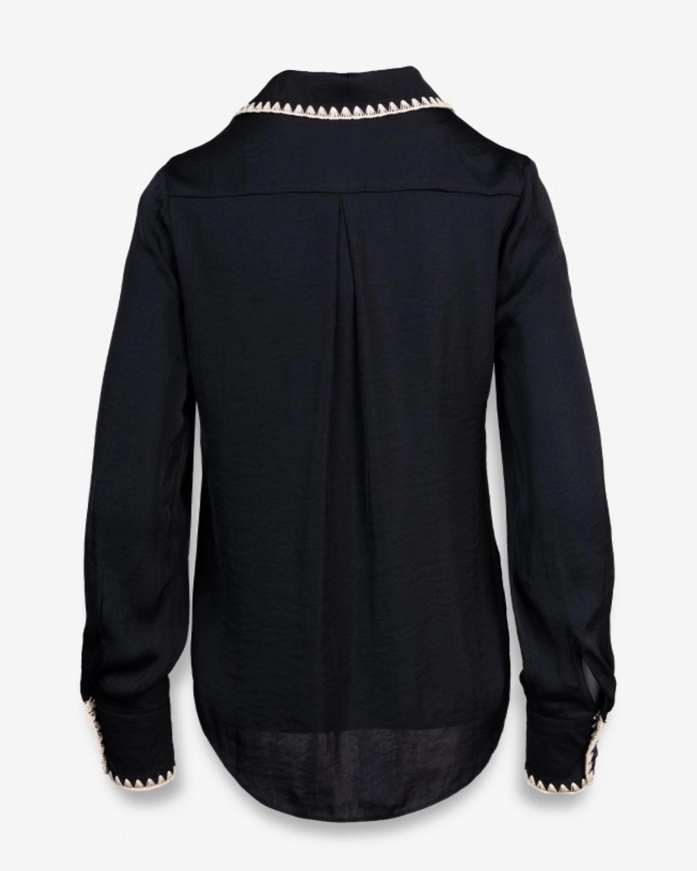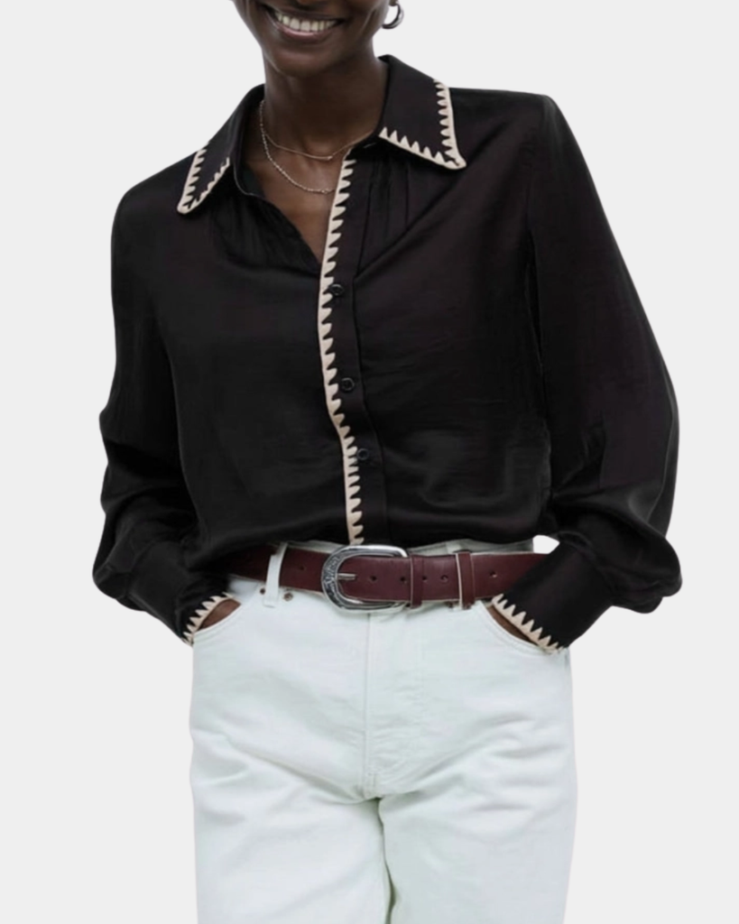 A polished wardrobe essential, this satin blouse features refined blanket-stitch detailing and a classic button-front cut. Its relaxed long sleeves and fluid drape work beautifully tucked or untucked for effortless versatility.