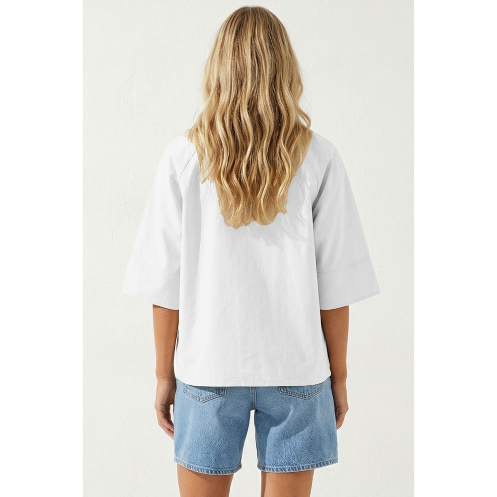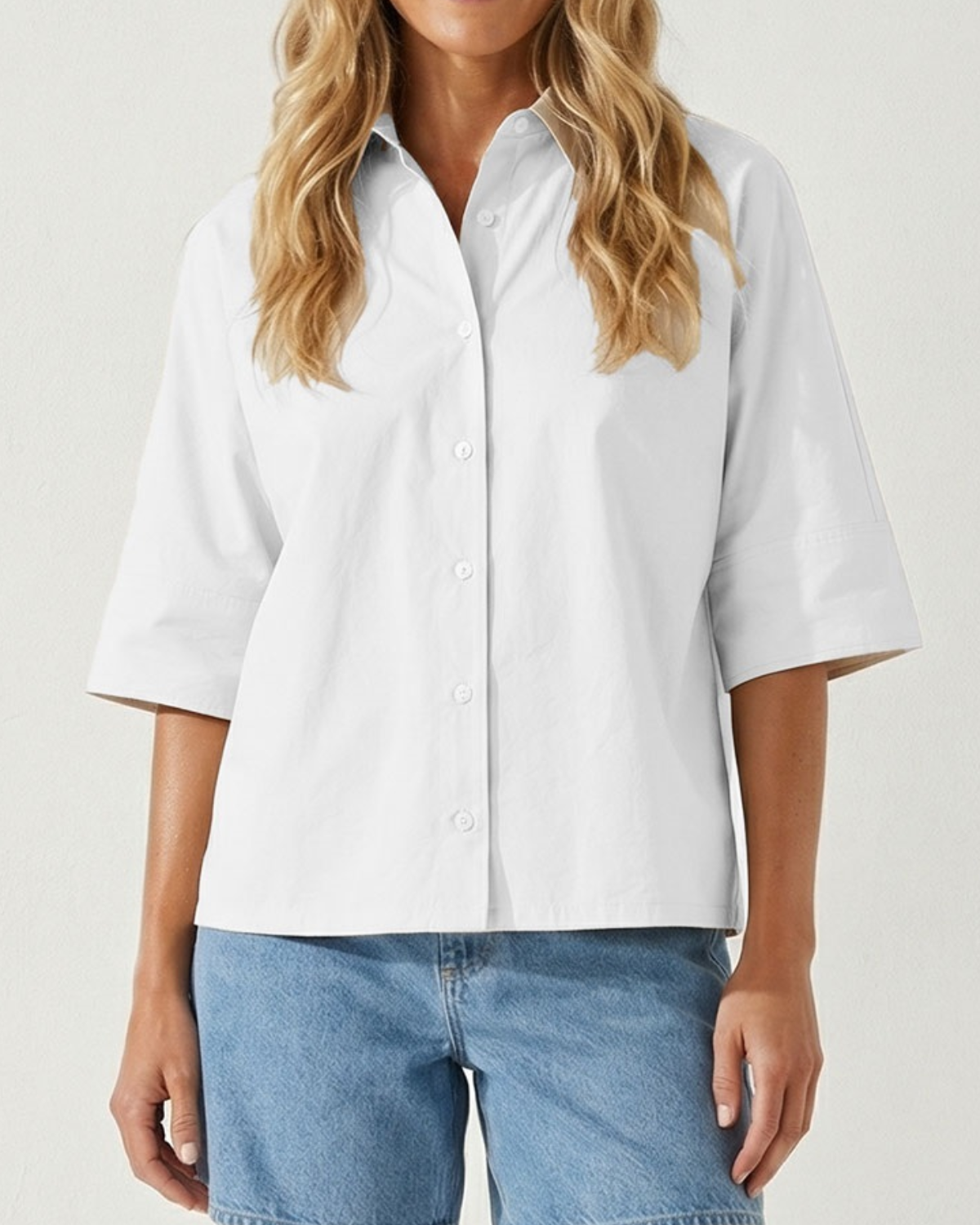 Lightweight woven fabric crafted for breathable comfort throughout the day. This boxy half-sleeve button-up features a relaxed, modern silhouette that transitions seamlessly from casual to polished. Pair with high-waisted trousers for refined elegance or style with denim for laid-back everyday wear.