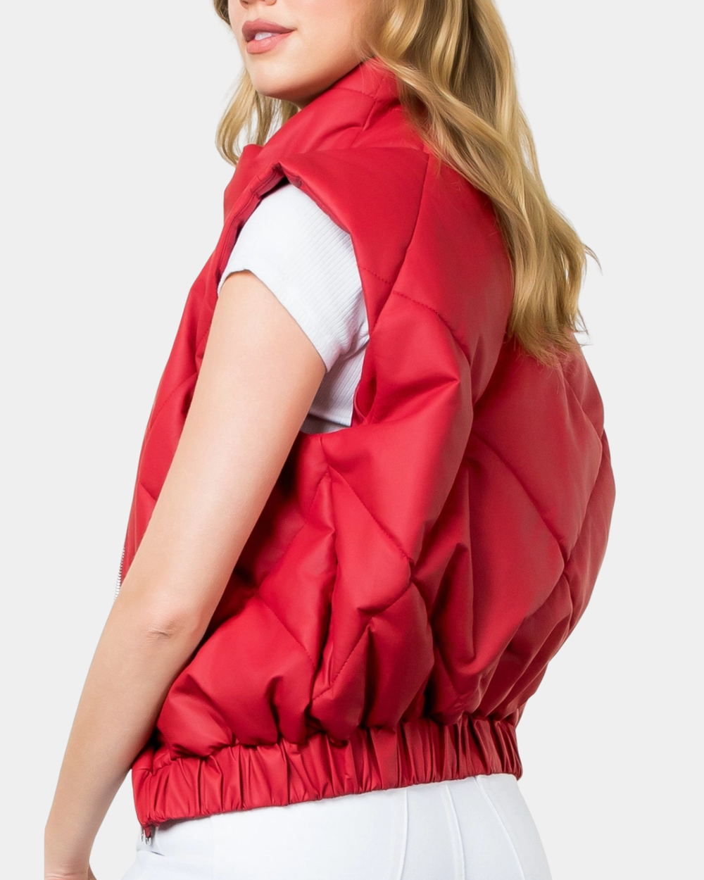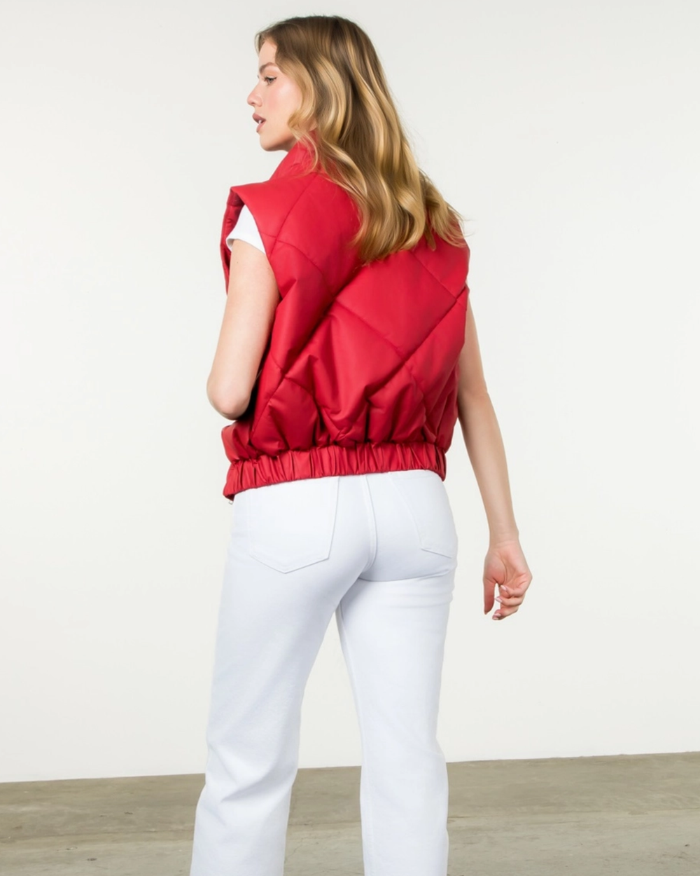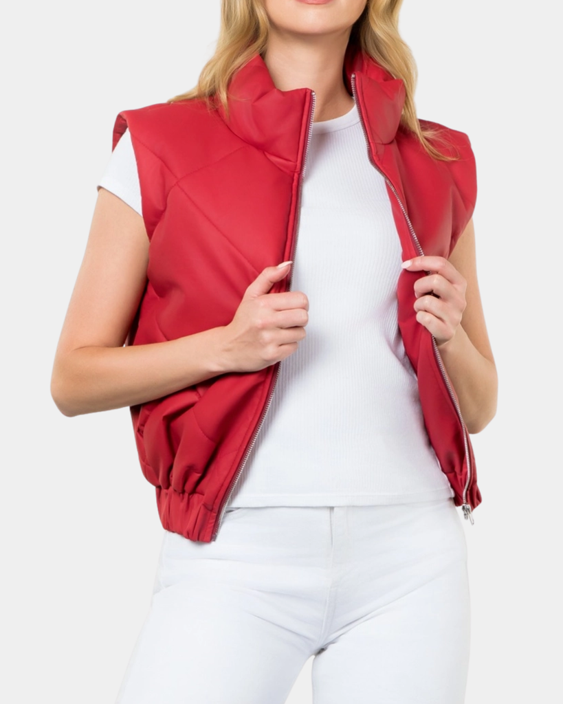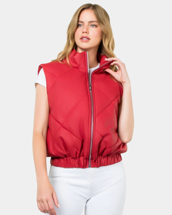 Strut your stuff in this fiery red puffer vest with a chic leather-look finish. Throw it on over anything for instant personality and warmth without the bulk.