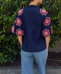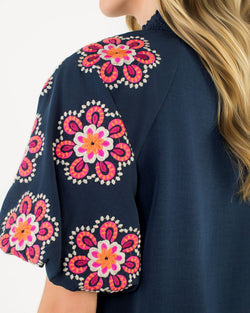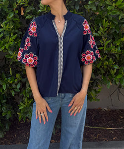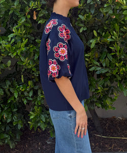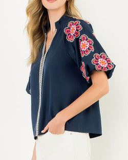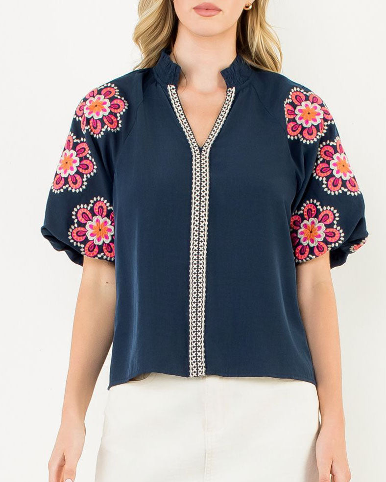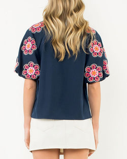 Add a touch of whimsy to your wardrobe with this navy embroidered puff sleeve top. Its delicate embroidery and voluminous sleeves create a charming, playful silhouette perfect for sunny days or casual outings. Lightweight and comfortable, it pairs effortlessly with your favorite jeans or skirts for a fun, flirty look.