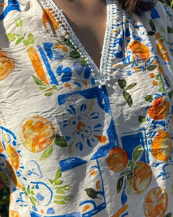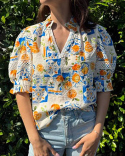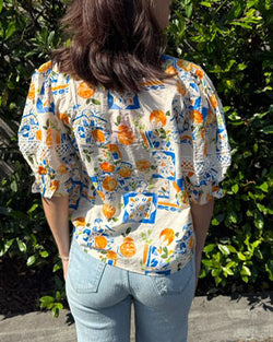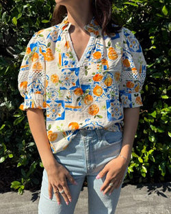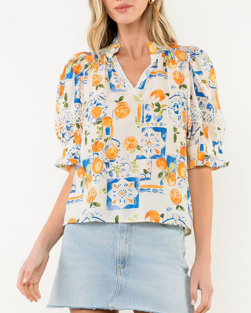 This adorable lemon print top features a v-neckline, short puff sleeves, a ruffle accent at the neck and lattice accent at the V-neck and hem. Style with everything from jeans to shorts to skirts for an effortlessly chic look.