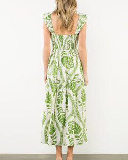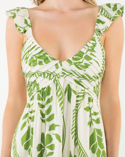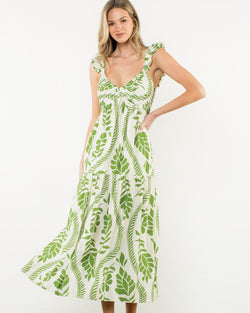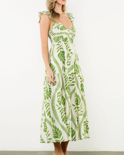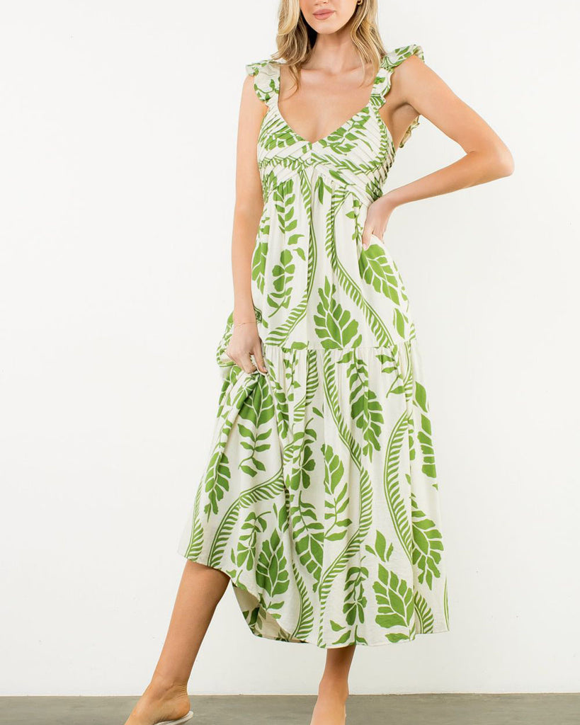 This gorgeous printed maxi dress features flutter detail on the straps and a v-neckline with pleat detailing at the bust. Lightweight and comfortable, this is a staple to wear all summer long.