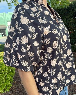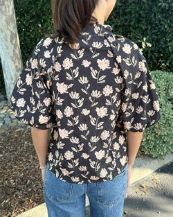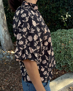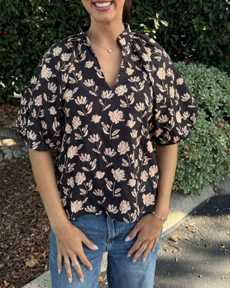 Elevate your fall wardrobe with this sophisticated black blouse featuring a delicate tan floral print. Designed with elegant puff short sleeves and a flattering V-neckline, it blends timeless femininity with modern style. The lightweight fabric ensures comfortable wear throughout the season, making it an ideal choice for both casual and dressier occasions.