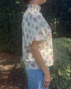 This pretty floral print top features a v-neckline, short sleeves and a contrast solid color detailing down the front and neck. Lightweight and comfortable, this top is a must for work or play.