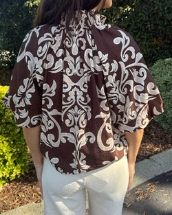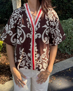 This short sleeve top features a paisley print, a v-neckline and contrast color detail at the neck and center of the top. Done in a rich brown shade, this top can be styled for work or play.