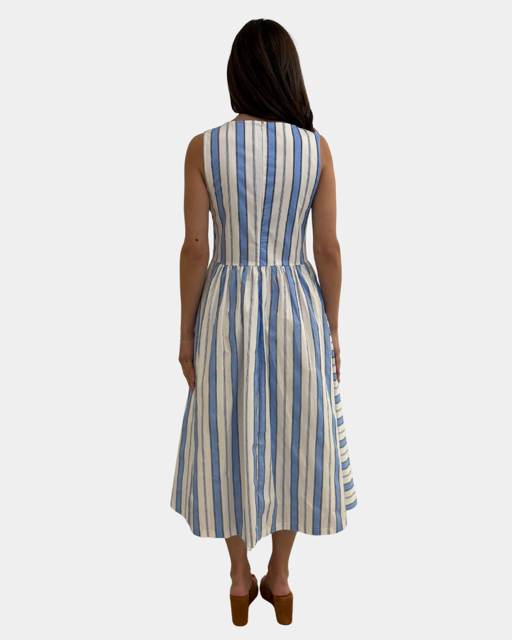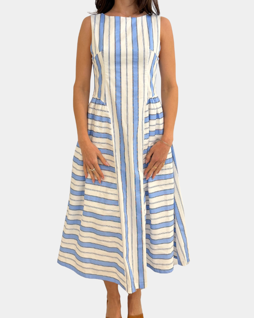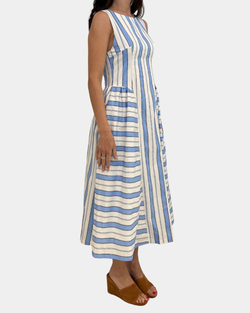 This sleeveless midi dress features classic striping in cool blue tones, perfect for effortless summer days or dressed-up evenings. The relaxed silhouette keeps you comfortable while the midi length adds a touch of sophistication.