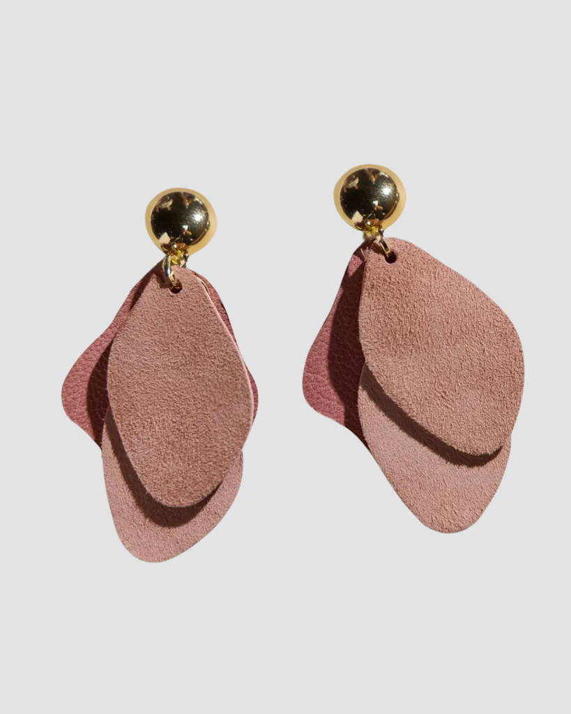 The Weston Earrings redefine leather accessories with Almond Suede Nappa leather paired with elegant gold studs. These unique, lightweight earrings blend fluid movement and modern sophistication in a striking statement piece.