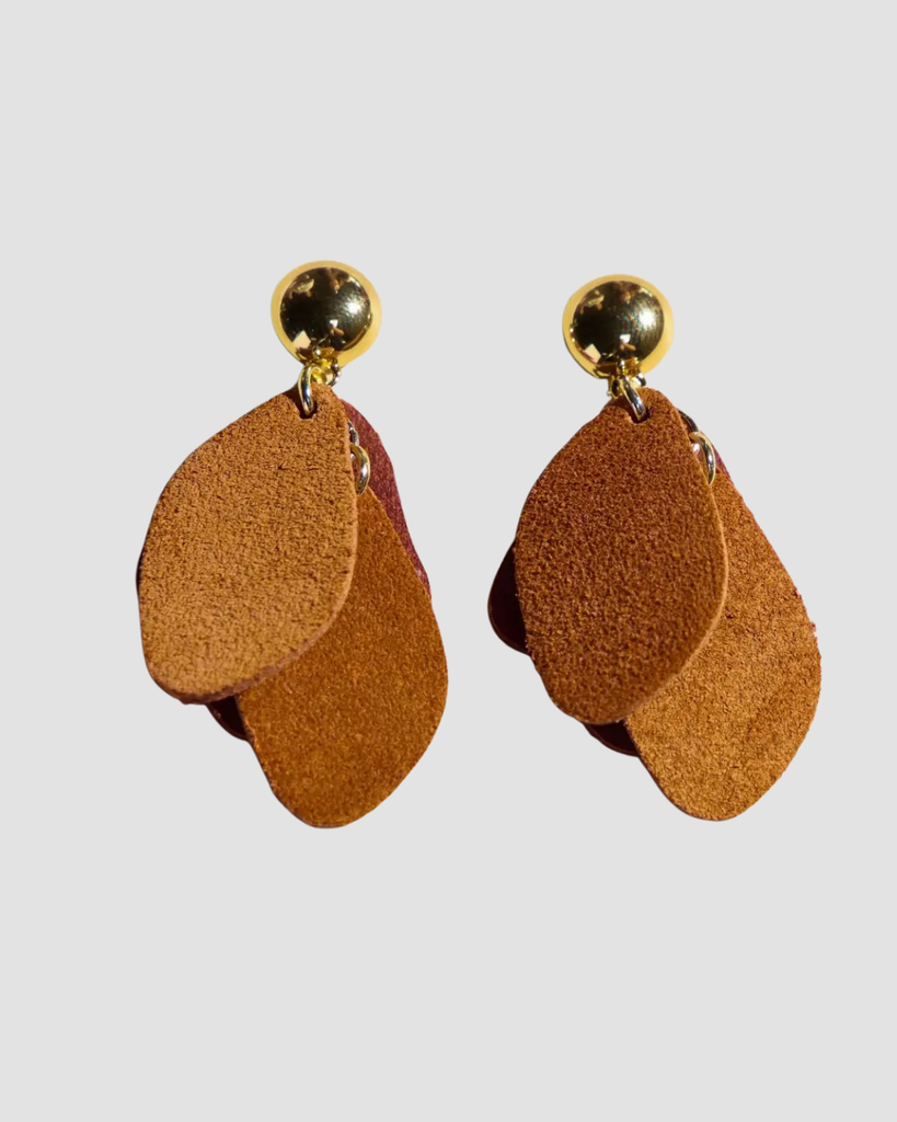 The Weston Earrings redefine leather accessories with Suede Nappa leather paired with elegant gold studs. These unique, lightweight earrings blend fluid movement and modern sophistication in a striking statement piece.