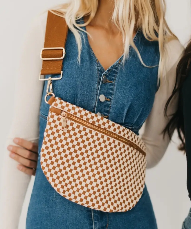 Meet the woven Westlyn bum bag! This design is such a classy take on a crossbody. The bag has a zipper closure with beige and black chevron interior, and a zippered stash pocket on the inside. This crossbody bag is the perfect way to elevate your look!