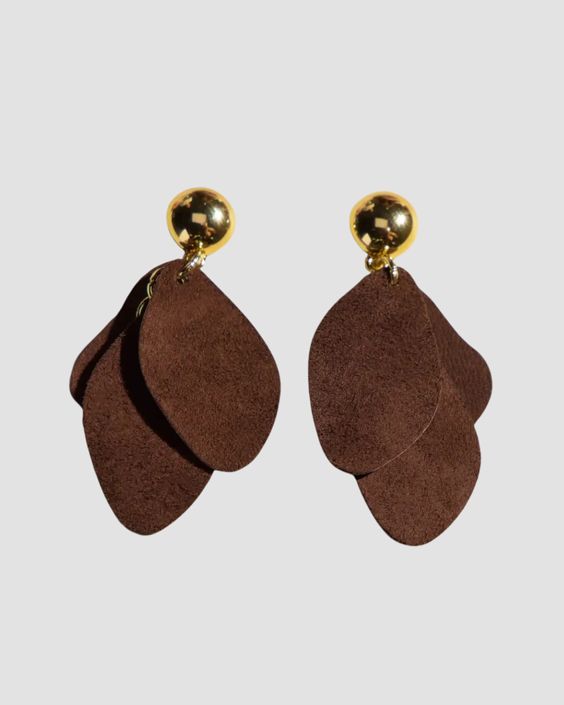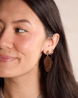 The Weston Earrings in chocolate brown leather provide a sophisticated neutral option for daily wear. Designed for comfort and lightness, they combine elegance with practicality.