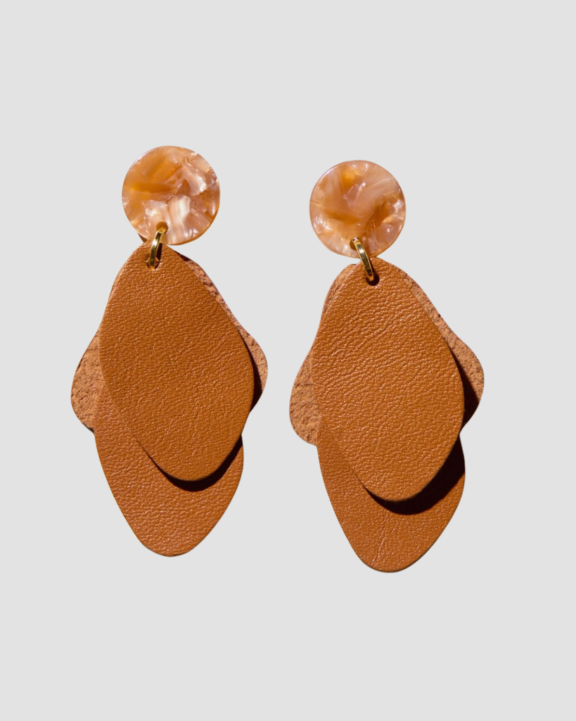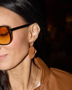 The Weston Earrings redefine leather accessories with Suede Nappa leather paired with elegant gold studs. These unique, lightweight earrings blend fluid movement and modern sophistication in a striking statement piece.