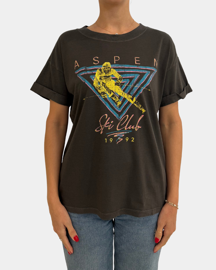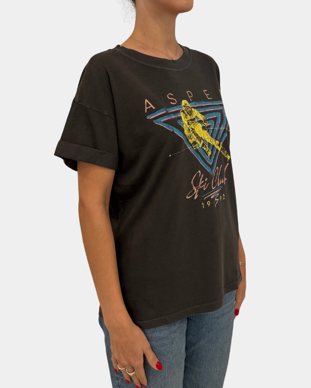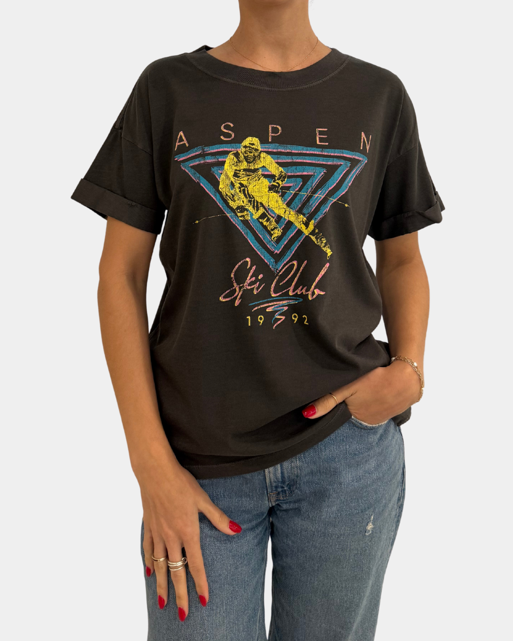 Hit the slopes—or just look like you do—in this vintage black Aspen Ski Club tee. Made from soft cotton with a retro graphic that screams cool.
