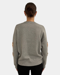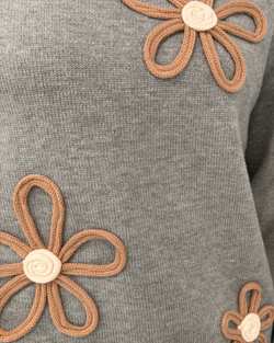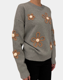 Wrap yourself in cozy charm with this grey knit sweater boasting playful floral details and a relaxed oversized fit.