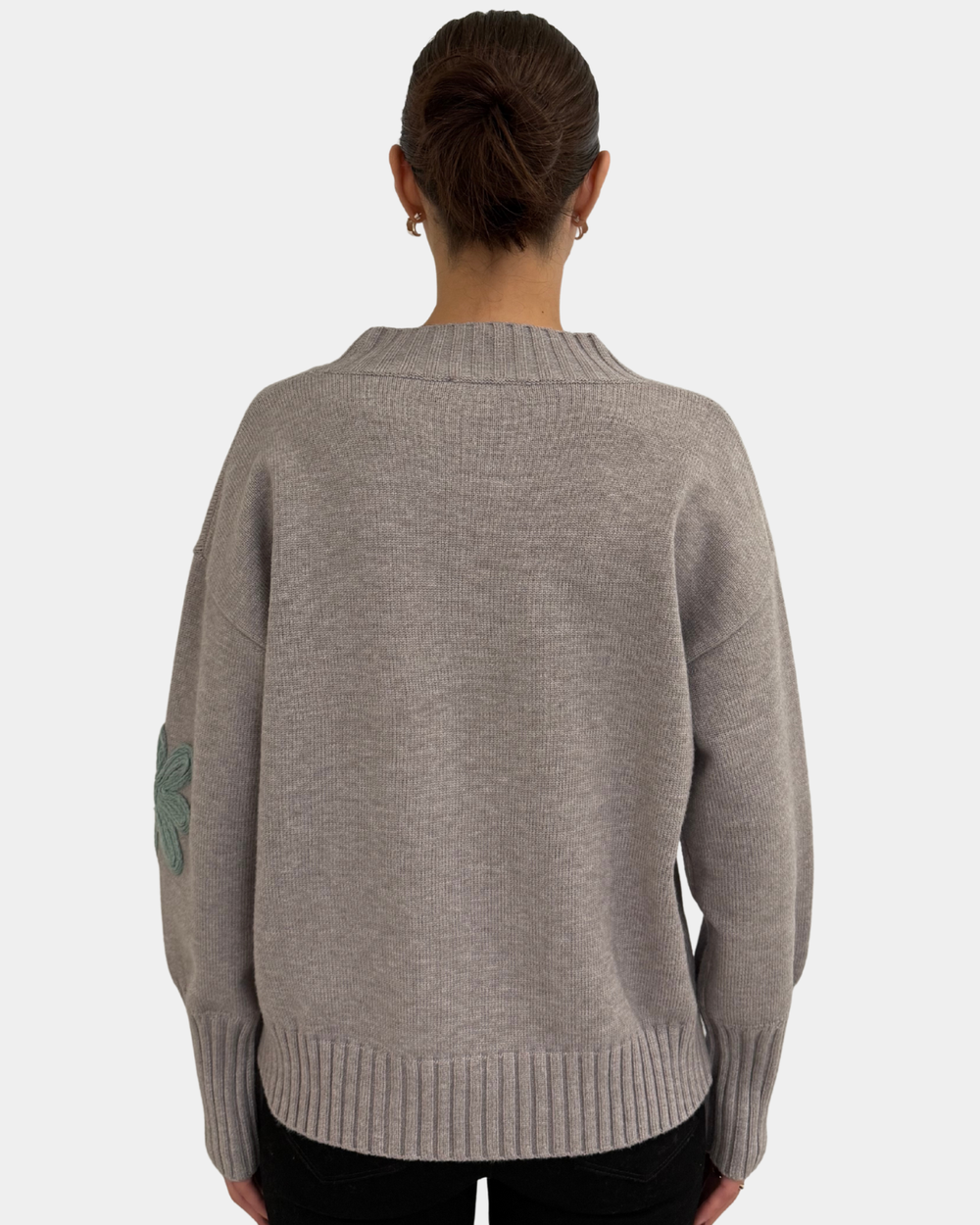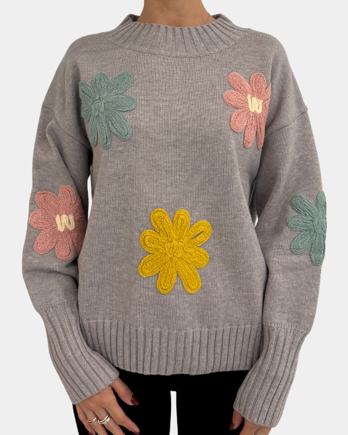 Wrap yourself in cozy charm with this grey knit sweater boasting playful floral details and a relaxed oversized fit.