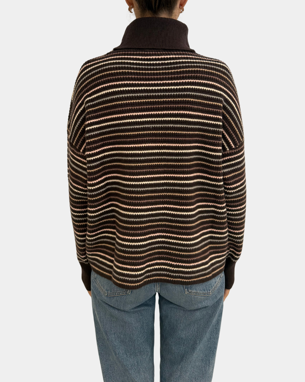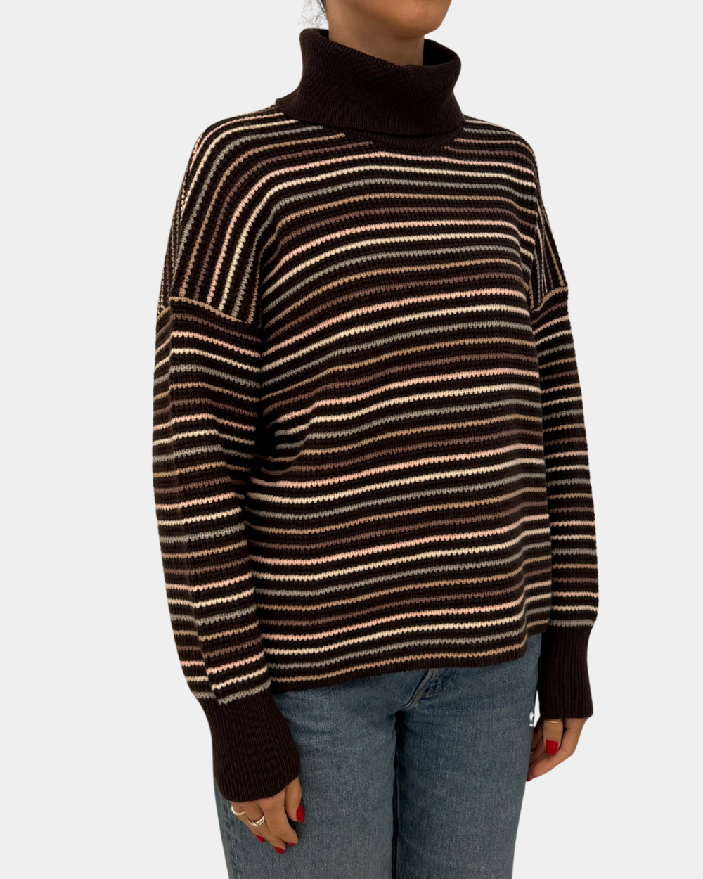 Strut your stuff in this brown turtleneck stripe sweater—a timeless classic with a fun twist. Cozy, versatile, and endlessly charming.