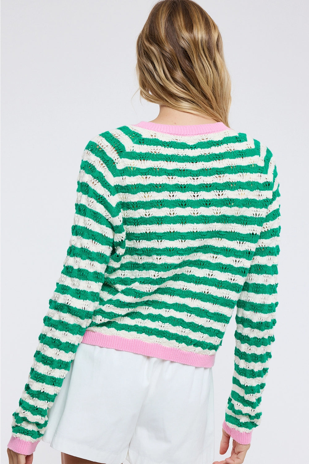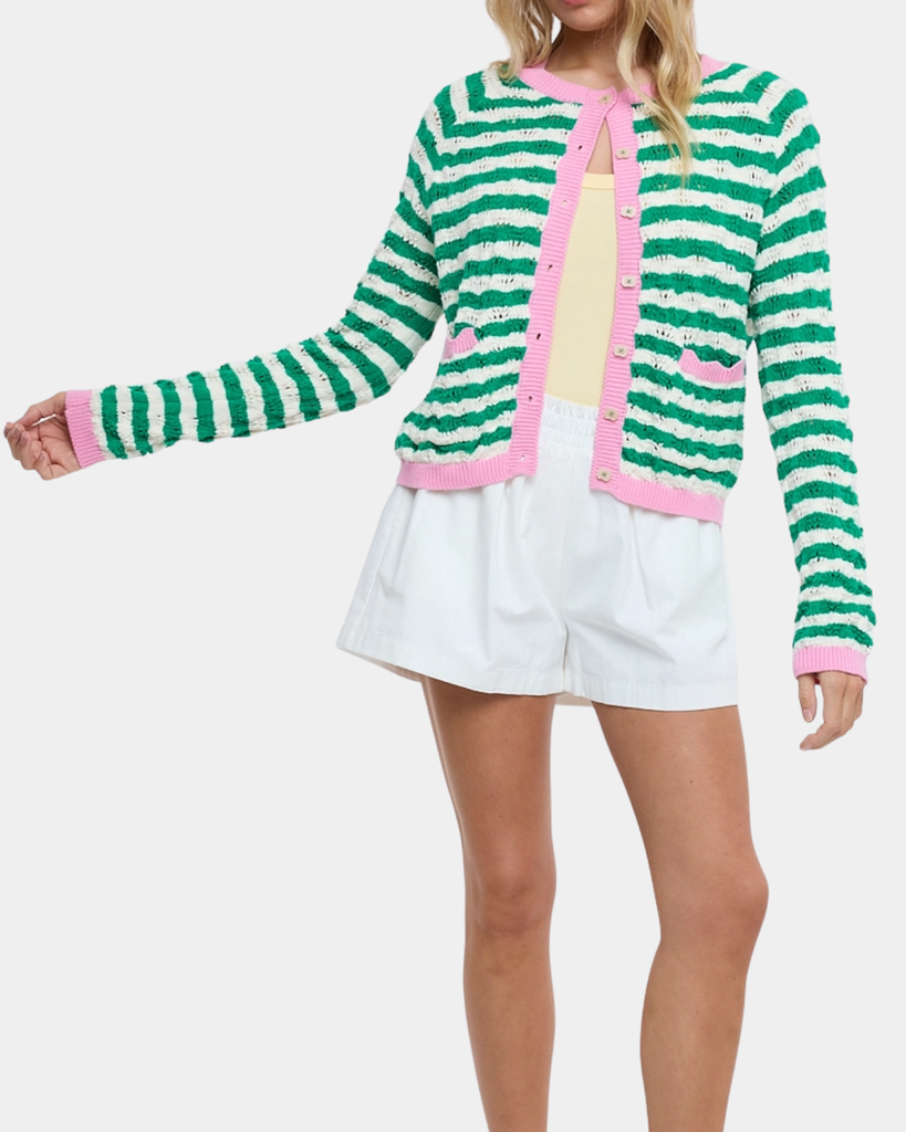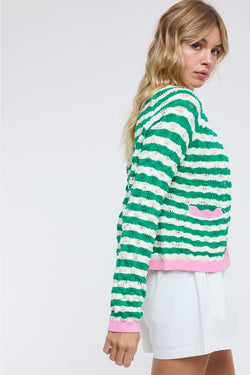 Playful wavy-striped cardigan in green and white with functional buttons and pockets. Perfect for layering through spring and summer with an effortless, seaside-inspired charm.