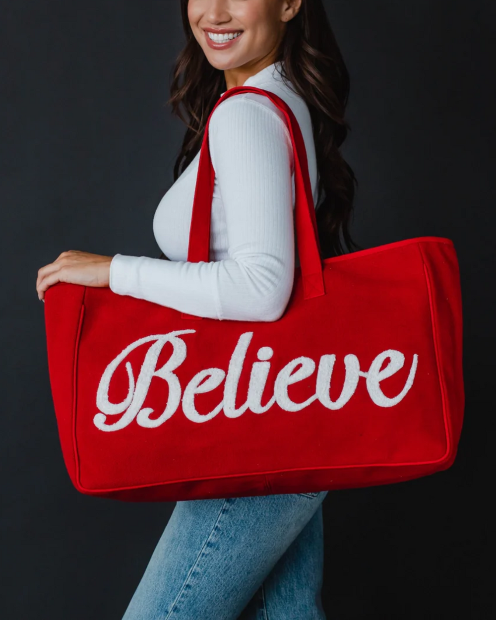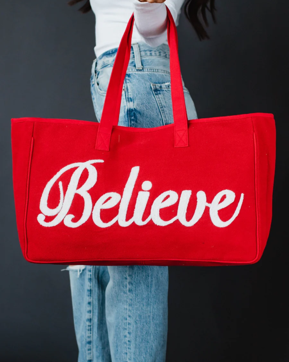 Carry holiday cheer everywhere with the bright red Believe Tote Bag, perfect for festive shopping or gifting. Its roomy design keeps your holiday essentials organized while spreading joyful vibes wherever you go.